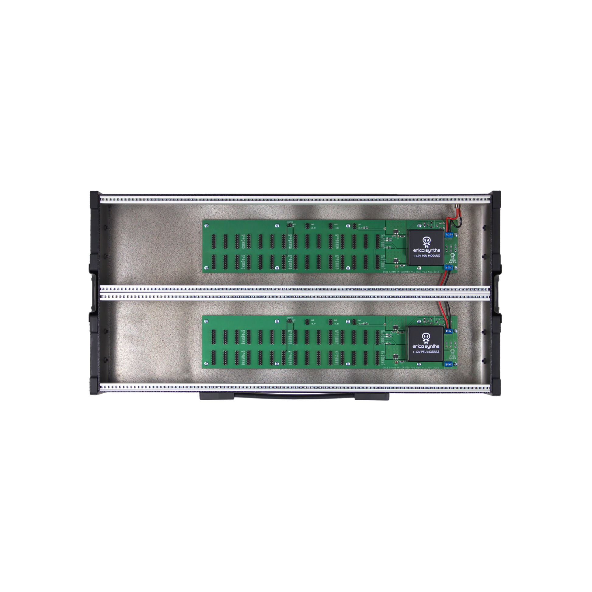 The case comes with built in universal PSU, that provides 2,5A@+12V, 2,5A@-12V, 1A@+5V and eurorack distribution boards with 60 module connectors.