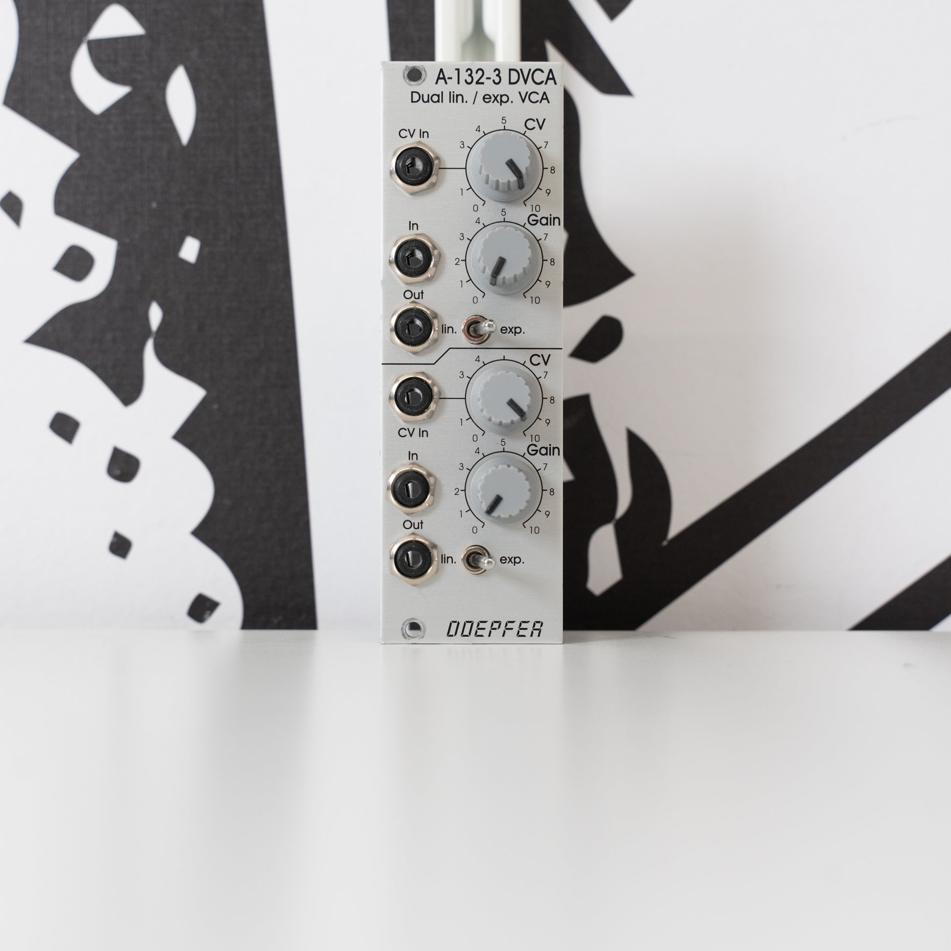 The Doepfer ‘A-132-3 DVCA’ is a Dual Linear/Exponential VCA Eurorack module with two identical voltage controlled amplifiers. Each VCA has a manual gain control and a control voltage input with attenuator. The character of the control scale can be switched to linear or exponential. All inputs and outputs are DC coupled. Consequently the VCAs can be used to process both audio and control voltages. The input has no attenuator available but is capable of processing up to 16Vss signals (i.e. -8V to +8V) without distortion.