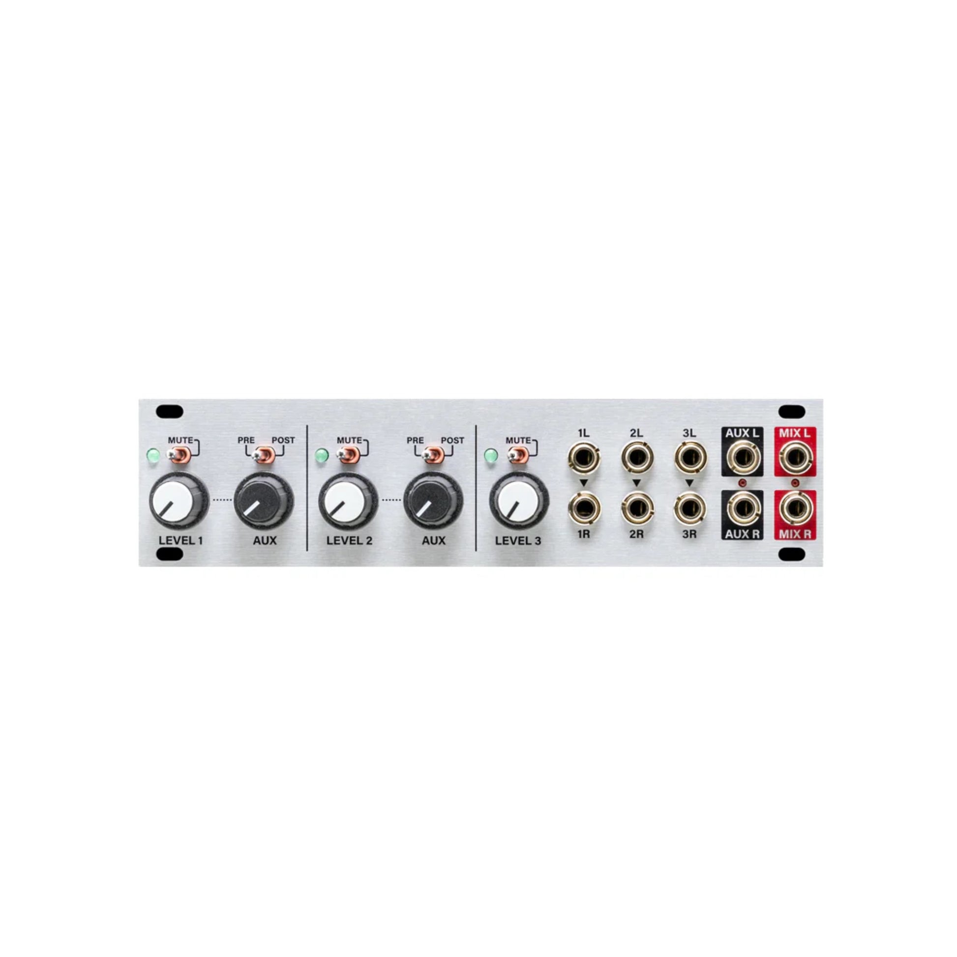 The Aux Mix 1U is a 3-channel stereo mixer module with a stereo Aux send bus. The Aux Mix 1U provides routing options for Send FX, Parallel Processing, Feedback Mixing, and more. It is designed for audio signals only (not for mixing CV).