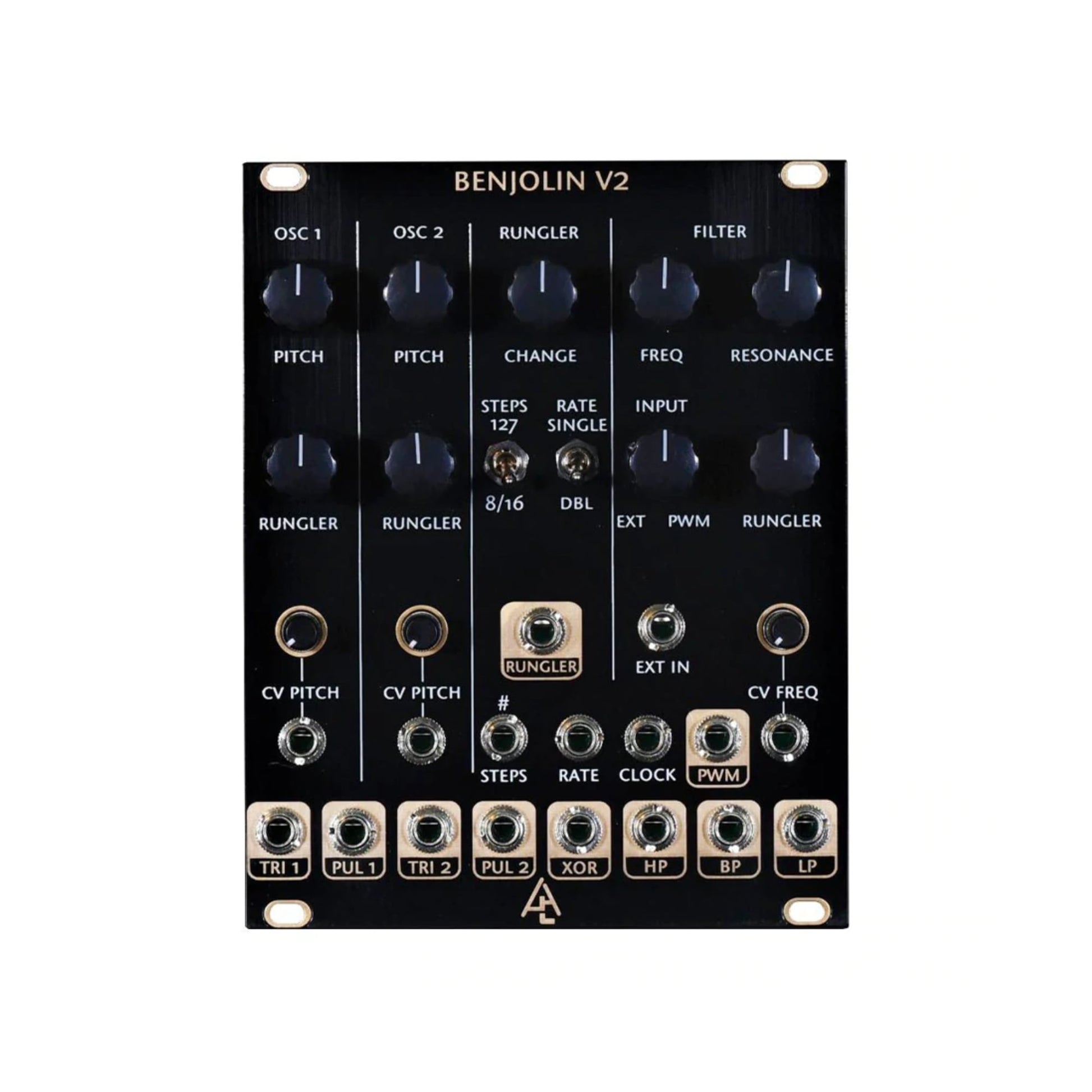 Rob Hordijk's latest revision of the classic Benjolin. The core of the Benjolin continues to be two oscillators, the rungler (stepped CV generator), and a multimode filter. This latest revision adds: