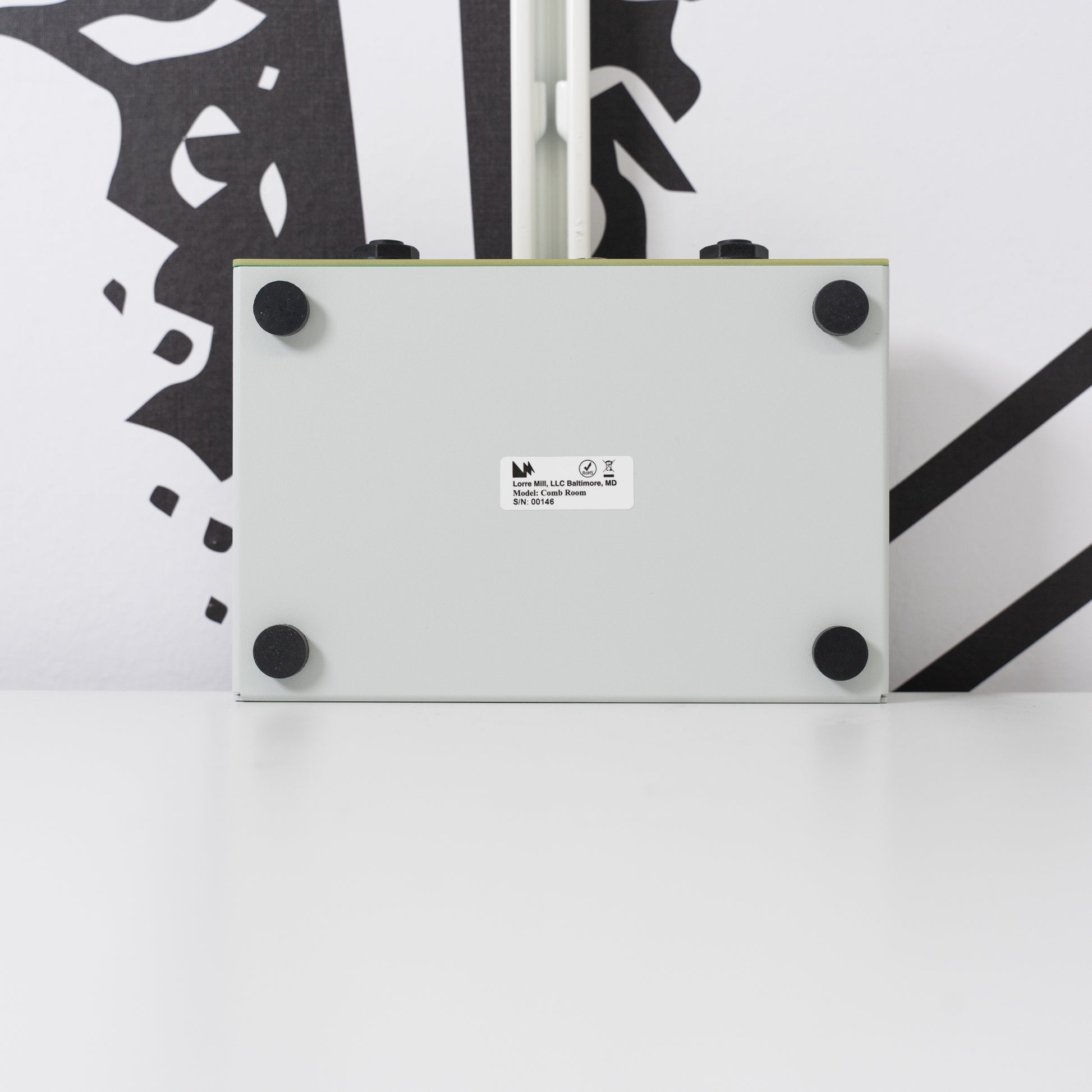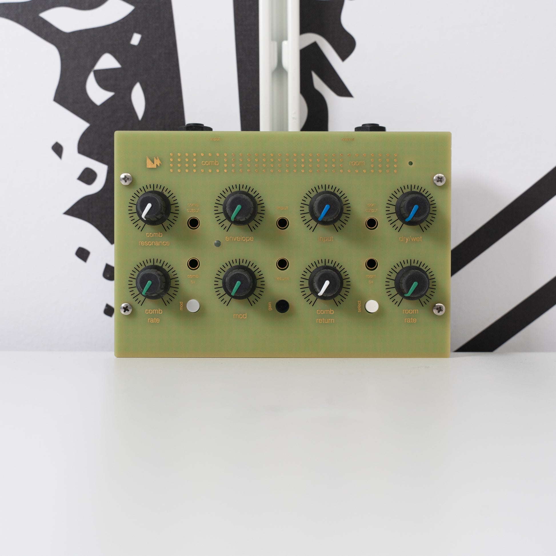 The comb room effect combines a dual delay (room circuit) and a comb filter to make echo/reverb-type sounds and resonant feedback. The comb filter is in the feedback path of the delays. An envelope follower gives movement to either the comb filter or the room circuit. The comb resonance control in conjunction with the comb return control can create self oscillation. The preamp for the 1/4” input has selectable gain of 10x or 40x and a soft clipping characteristic. The comb and room circuits are both built around 1 bit delta-sigma converters. In the case of the delays, the analog to digital conversion is done in the PT2399 echo IC. The comb filter uses a simple and gritty A/D converter built of logic chips and op-amps. Which gives the filter a characteristic sound. Clock noise can be heard at lower frequency settings. Patching the room output to the return will bypass feedback through the filter, allowing all frequencies to echo.