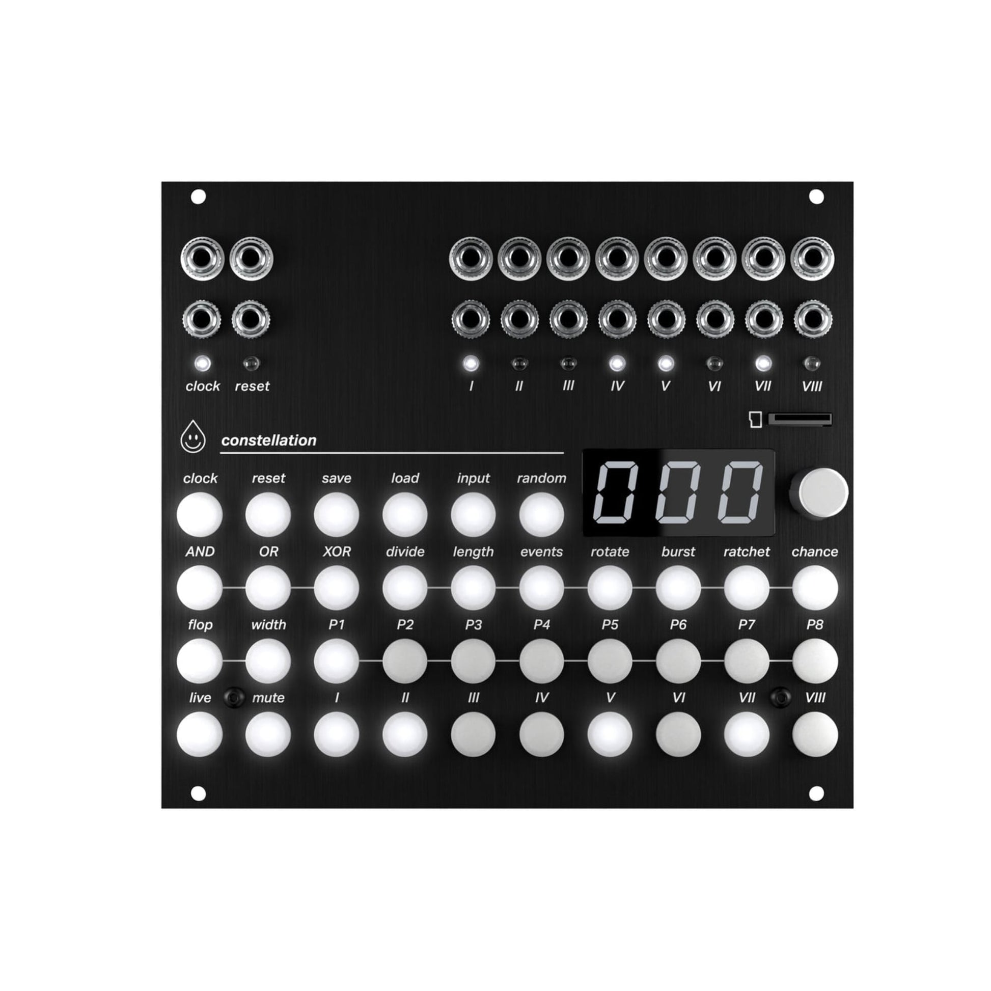 Constellation is all about rhythm. It is an 8 channel pattern generator that works by combining multiple dense and sparse patterns to create long, complex and musically interesting trigger and gate rhythms. Constellation takes a "parametric" approach to rhythm - there is no explicit step sequencing on the module, rather the rhythms are defined by Euclidean (and more) parameters that build the rhythm mathematically.