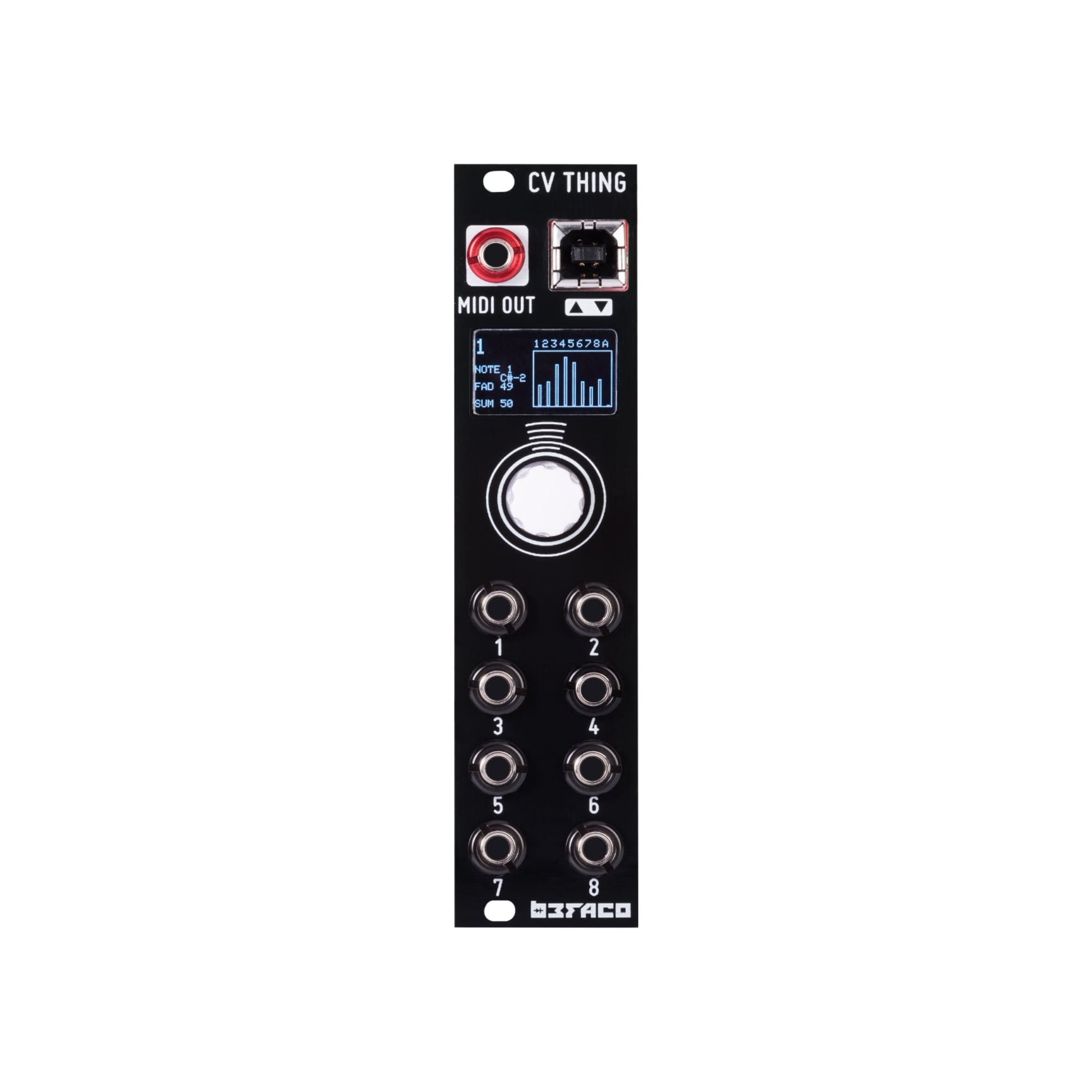 CV Thing is a fully mappable CV to MIDI converter in just 6HP. Its based on our VCMC module, but aiming for small and compact performance rigs. It has eight inputs that can be mapped to any MIDI message quite easily thanks to its simple and intuitive user interface. CCs, Program change ,V/Oct to Note or Clock are some of the messages that can be configured to easily control MIDI gear from your modular rig.