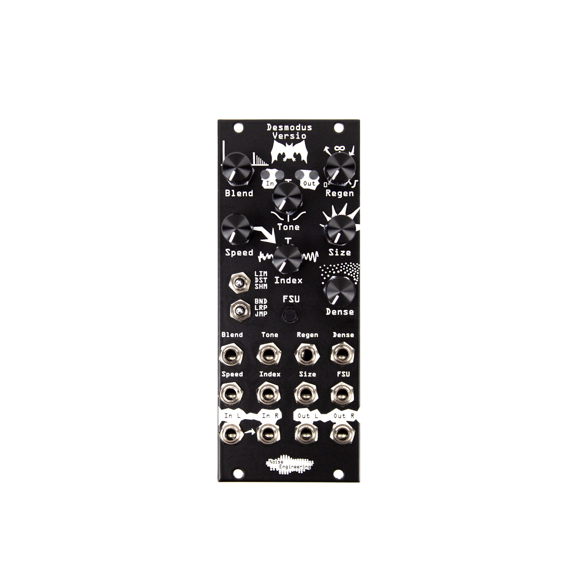Desmodus Versio is Noise Engineering’s long anticipated take on a reverb. This is a true stereo in/stereo out or mono in/stereo out effect. Less of a room simulator and more of a synthetic tail generator with features designed for sound design and performance, the parameters on DV allow you to take the effect from a delay to a beautiful reverb to an uncanny, nightmarish atmosphere in the twist of a few knobs.