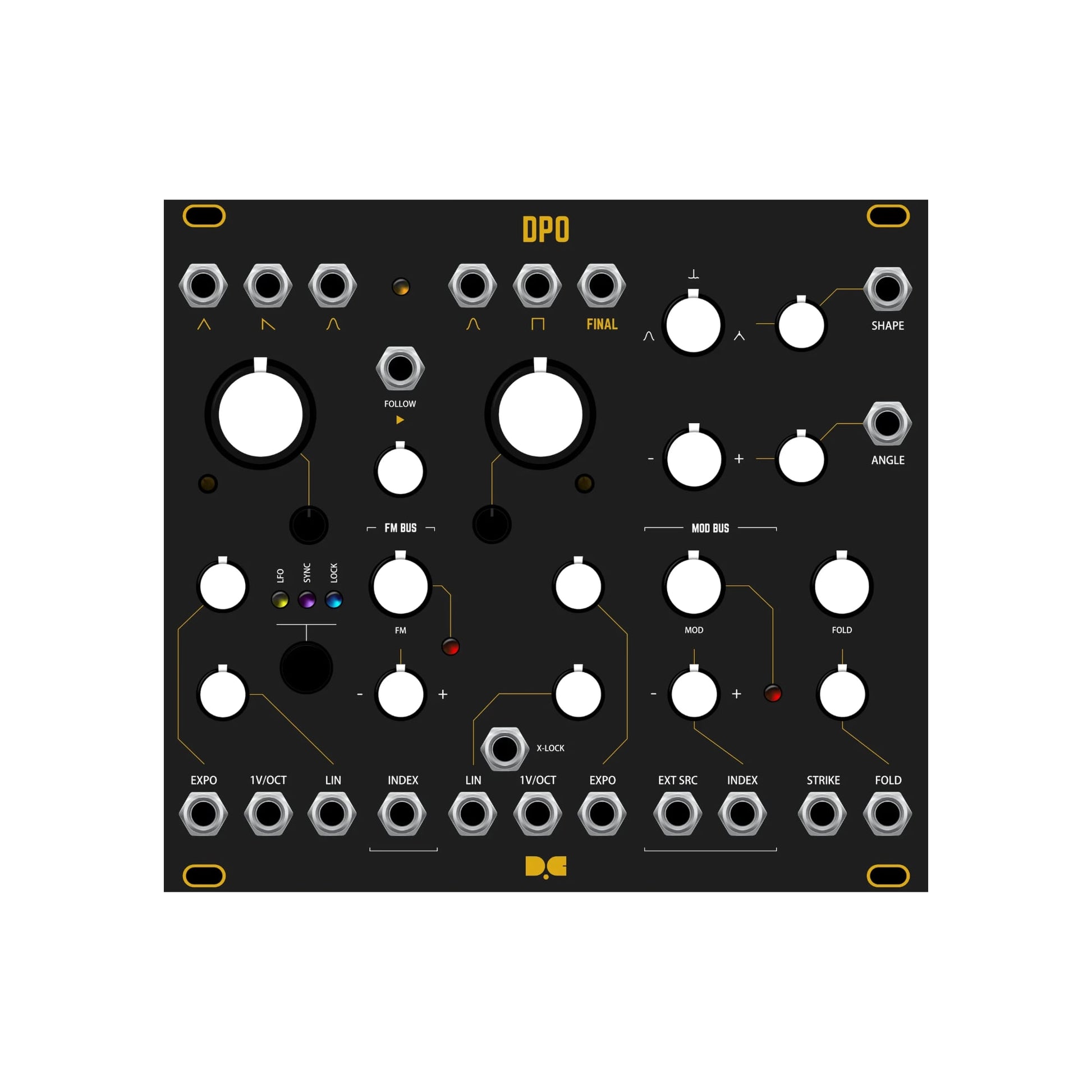 This is a black and gold panel designed for the Make Noise DPO module. The design is clean and simple, with a few tweaks compared to the original one. It has wider racking holes that makes it possible to adjust the position of the module precisely on your case.