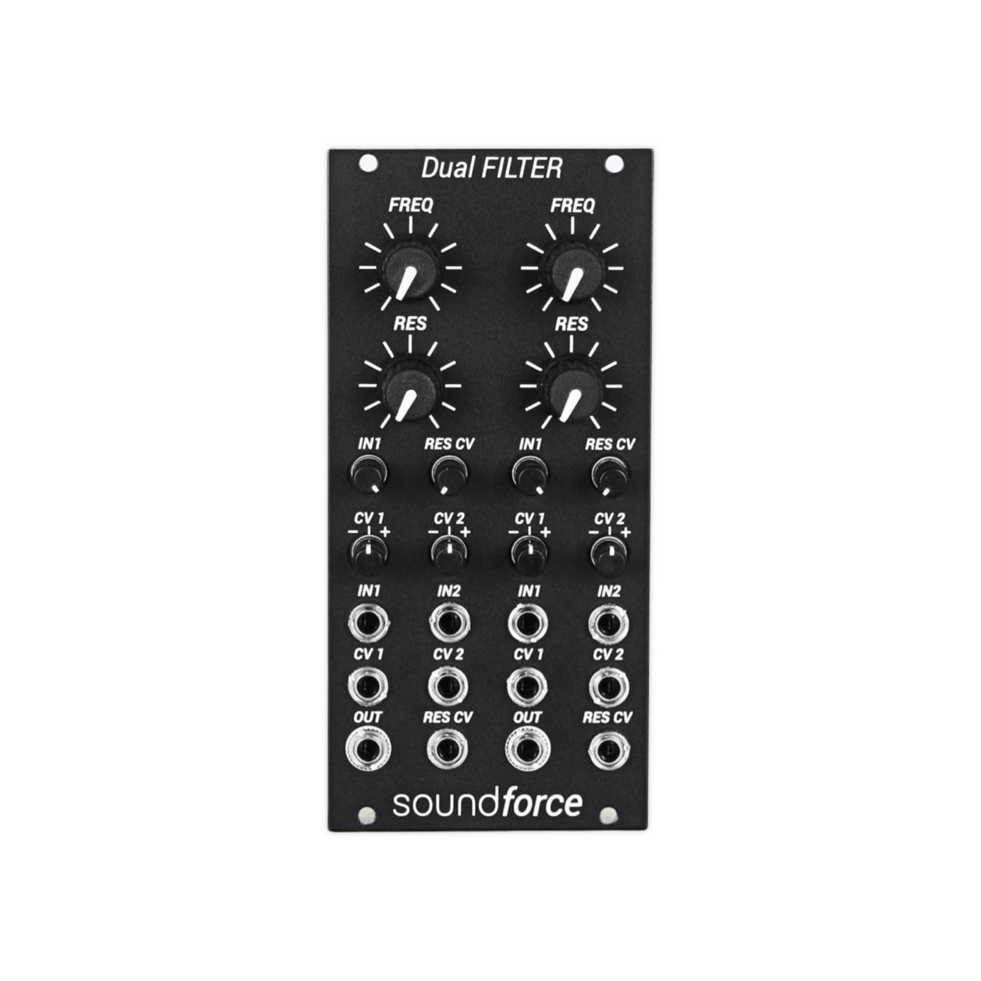 The SoundForce Dual Filter features 2 identical filter sections, one on the left and one on the right. Each filter has 2 audio inputs (one of which has a level control pot IN1), a manual cut off frequency pot and a manual resonance pot. There are 2 CV inputs for the cut off frequency both with their attenuverters and 1 CV input for the resonance with an attenuator.