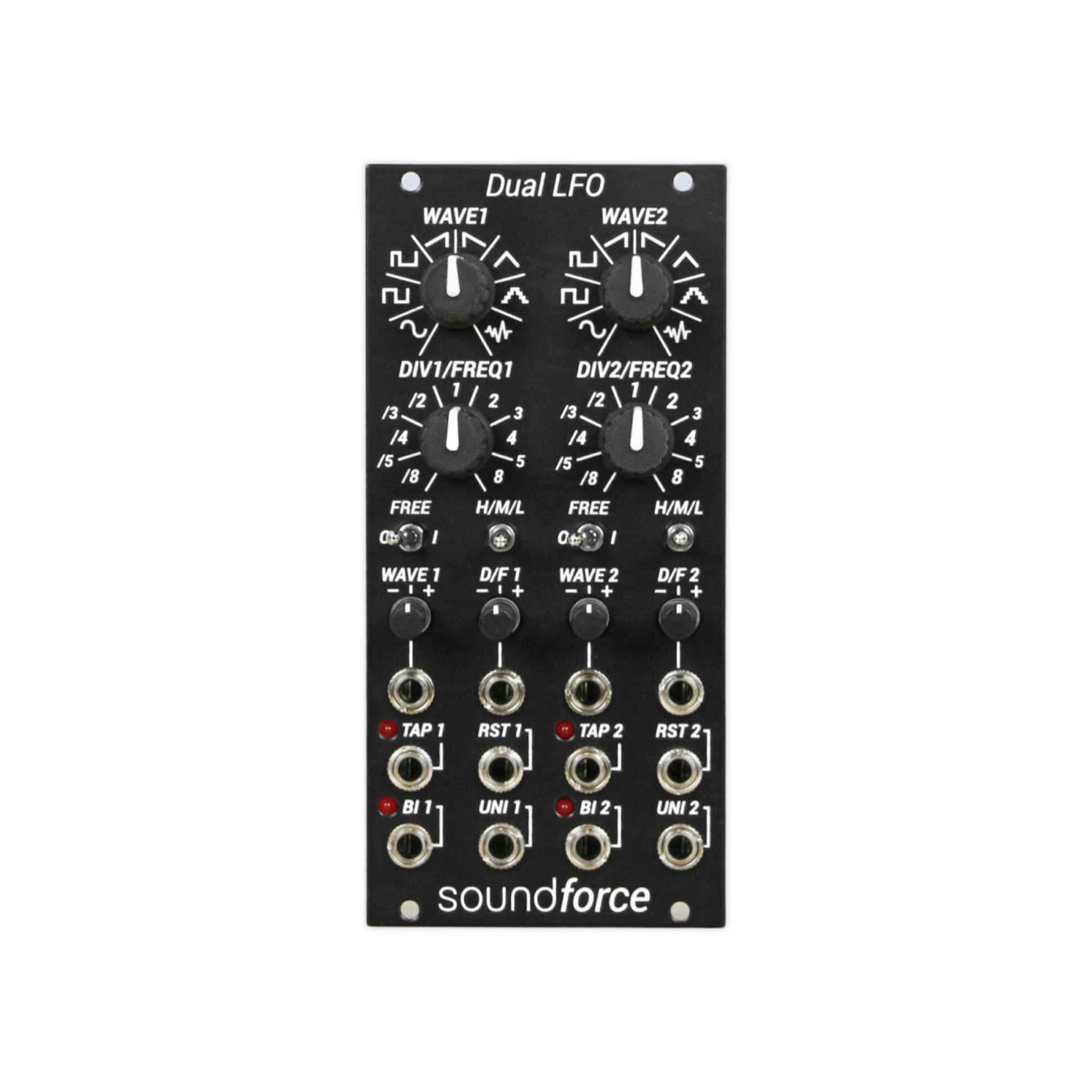The SoundForce Dual LFO is a straight-forward and easy-to-use module that can be used as a free-running LFO but can also be synced to an external clock signal using the TAP input. It features 2 identical LFO sections, one on the left and one on the right.