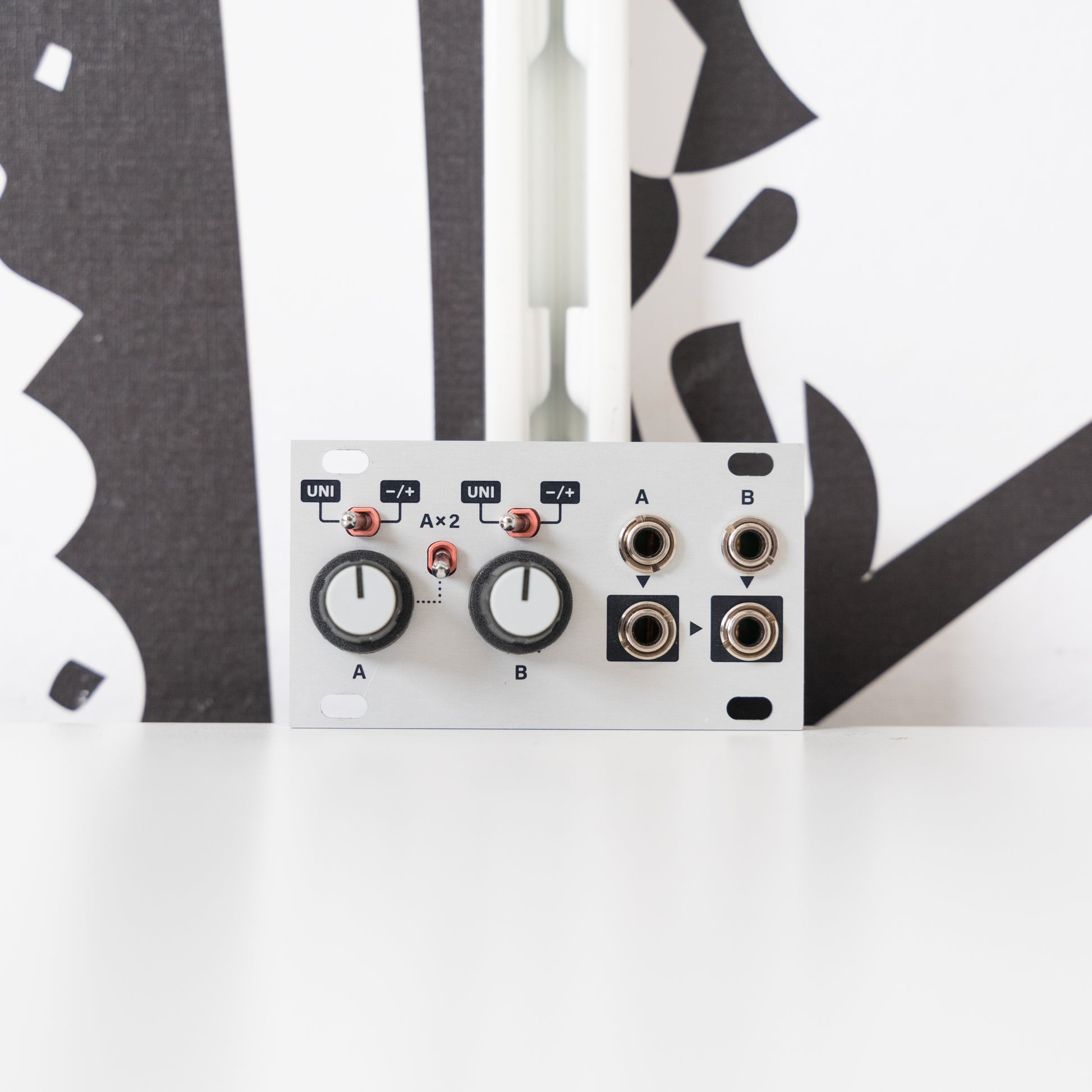 Channel A’s output is normalled into the output of channel B for mixing duties, and channel A has has a 2x voltage multiplier switch, allowing you to double the voltage sent into Channel A.
