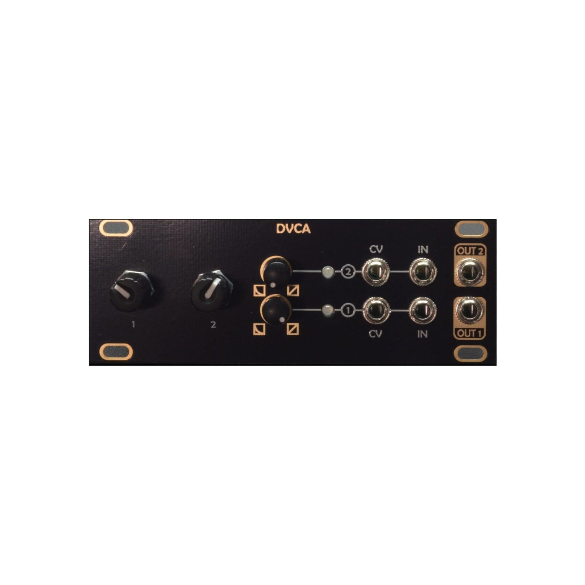 DVCA is a dual VCA based on the Mutable Instruments Veils. It features two separate voltage controlled amplifiers, both with a gain and a response curve potentiometer, that is variable from linear to exponential. The outputs are normaled, so when no patch cable is present on output 1, output 2 will contain both signals, allowing the module to be used as a mixer.