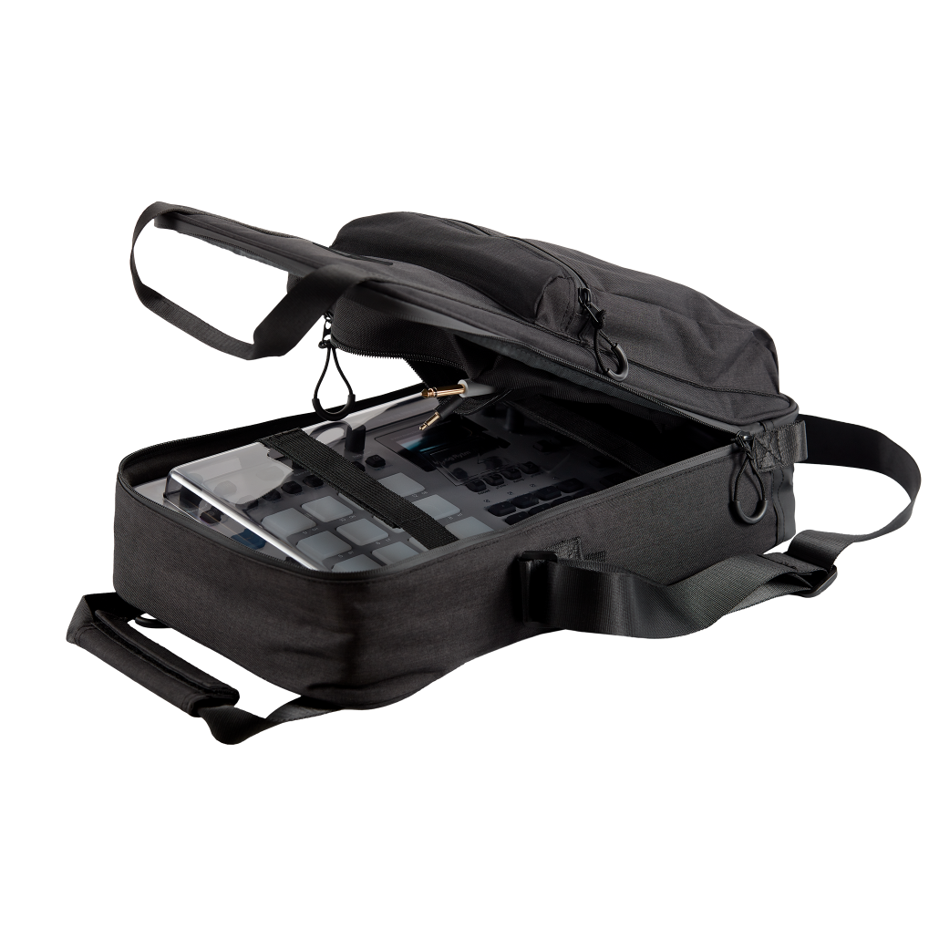 The Goldilocks of Elektron carry bags. The water resistant black nylon canvas keeps your machines safe and dry whatever the weather. Adapt depending on your gear-carrying needs courtesy of the main compartment’s flannelette lining, adjustable velcro divider, and interior straps. Included is a removable compartment for PSUs, audio cables, and CF-cards that can be secured inside the bag. Two exterior compartments allow for quick access and tablet storage, while a carabiner hook is available for bottles or keyrings.