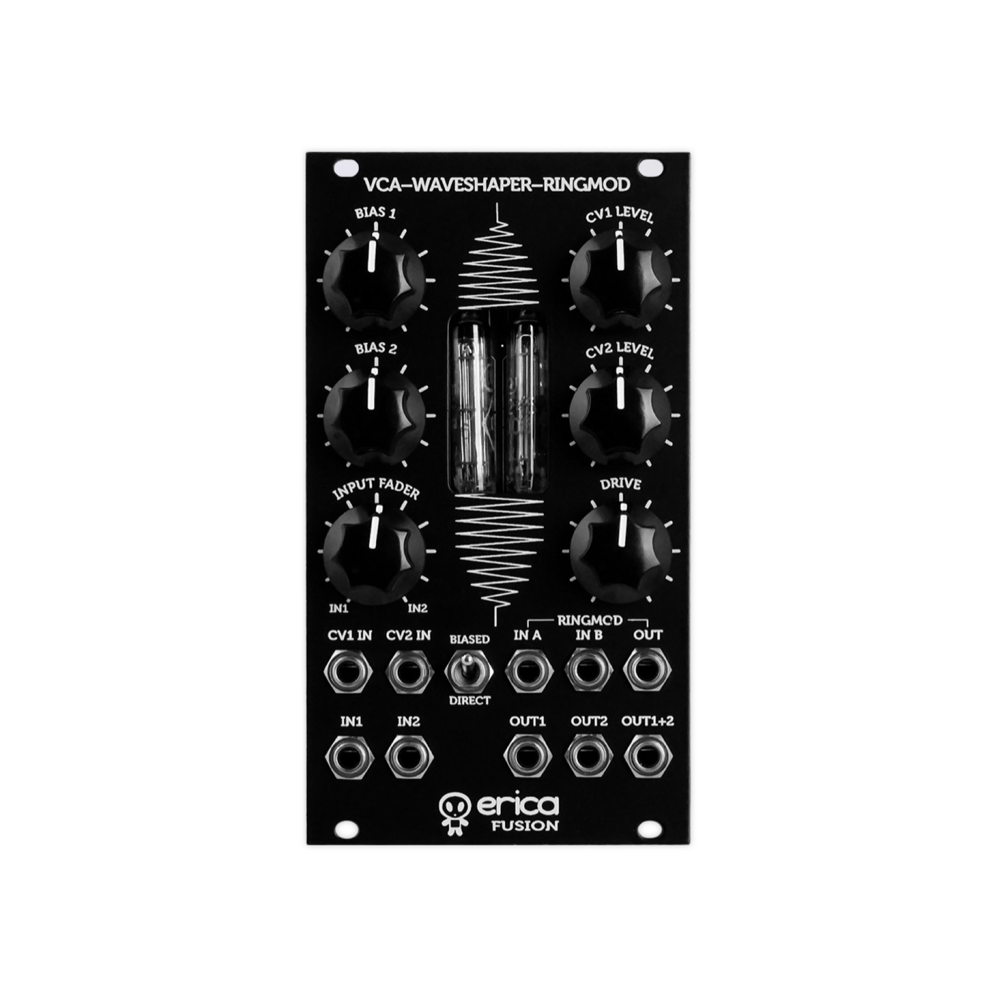 The Fusion VCA/Waveshaper/Ringmodulator is a complex sound processor that combines VCA, waveshaper and ringmodulator. It’s not a regular VCA; it can operate as one, but most of the power of the module is in advanced modulations – with two CVs applied simultaneously to different stages of the VCA, audio rate modulations, using ringmodulator as a waveshaper – your imagination is the limit!