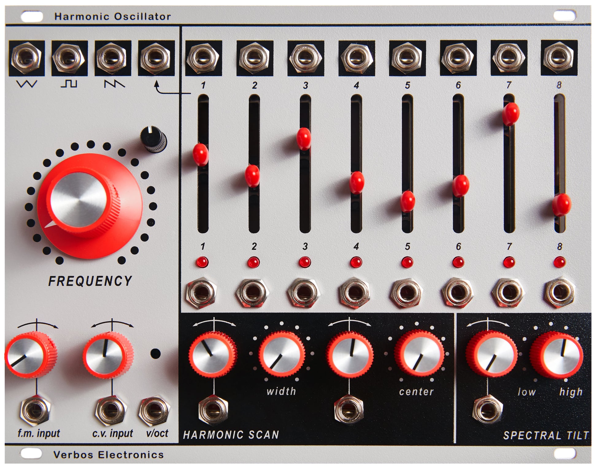 Verbos brings the previous unthinkable to your eurorack setup: additive synthesis. The Harmonic Oscillator allows you to mix between the first 8 harmonics with sine, triangle, square or saw waves. It features a wealth of CV options for tilting, scanning and mixing the harmonics using external control or from the front panel.