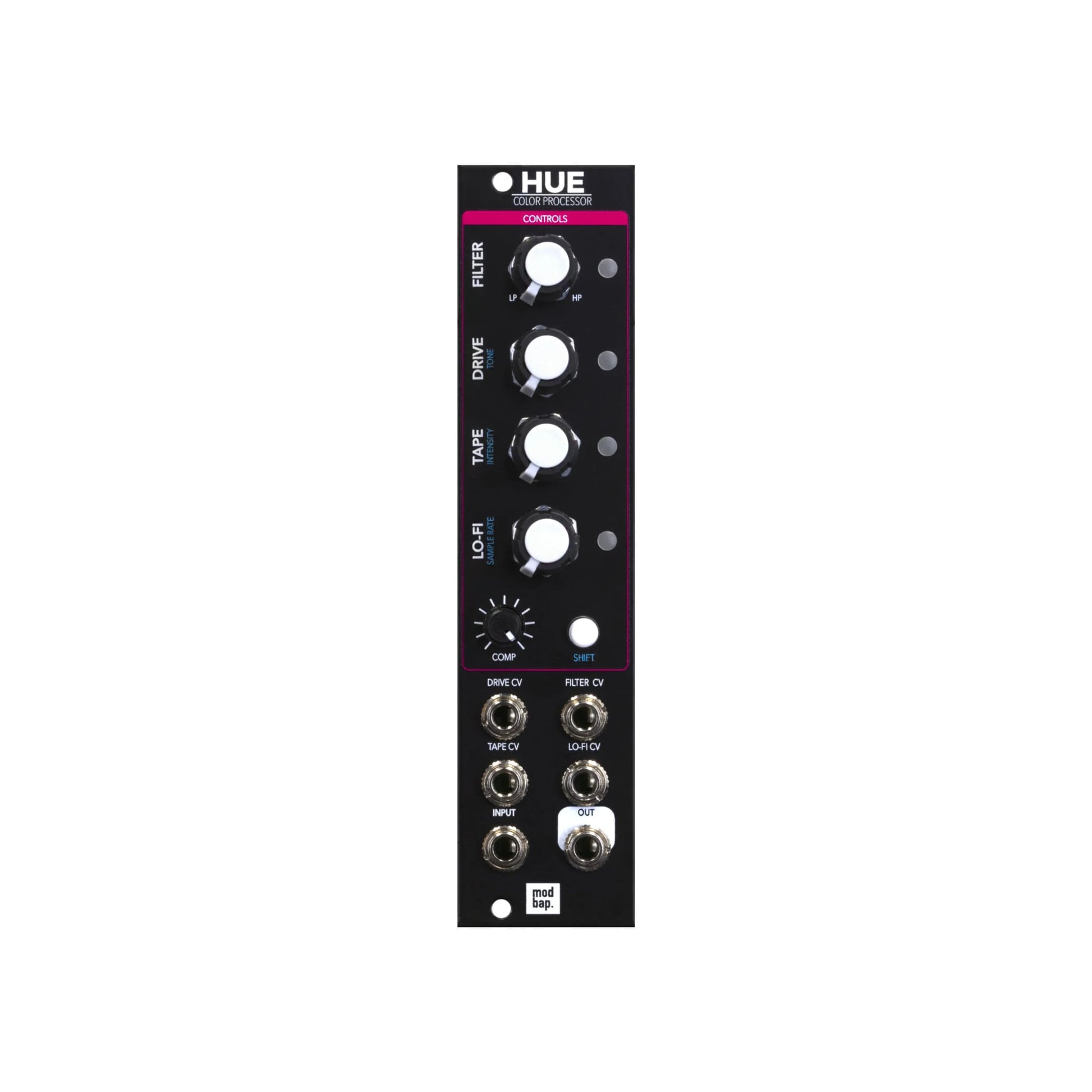HUE's goal is to simply color your sound. The initial concept was born of a debate about the techniques and processes used to make drum machines sound big, bold, and delicious. The sounds that tug at the hearts of boombap, LoFi, and subsequently modbap, enthusiasts are those that have great texture, lush degradation, soft distortion, and big bold strokes of color. The classic beloved drum machines were often processed with outboard gear, recorded to tape, pressed to vinyl, played in big booming systems, sampled, and resampled and on and on. Ultimately, those are the sounds that become nostalgic and reminiscent of all that we love about classic LoFi boombap production. HUE is our attempt at bringing that vibe into eurorack with a cute little 6hp package.