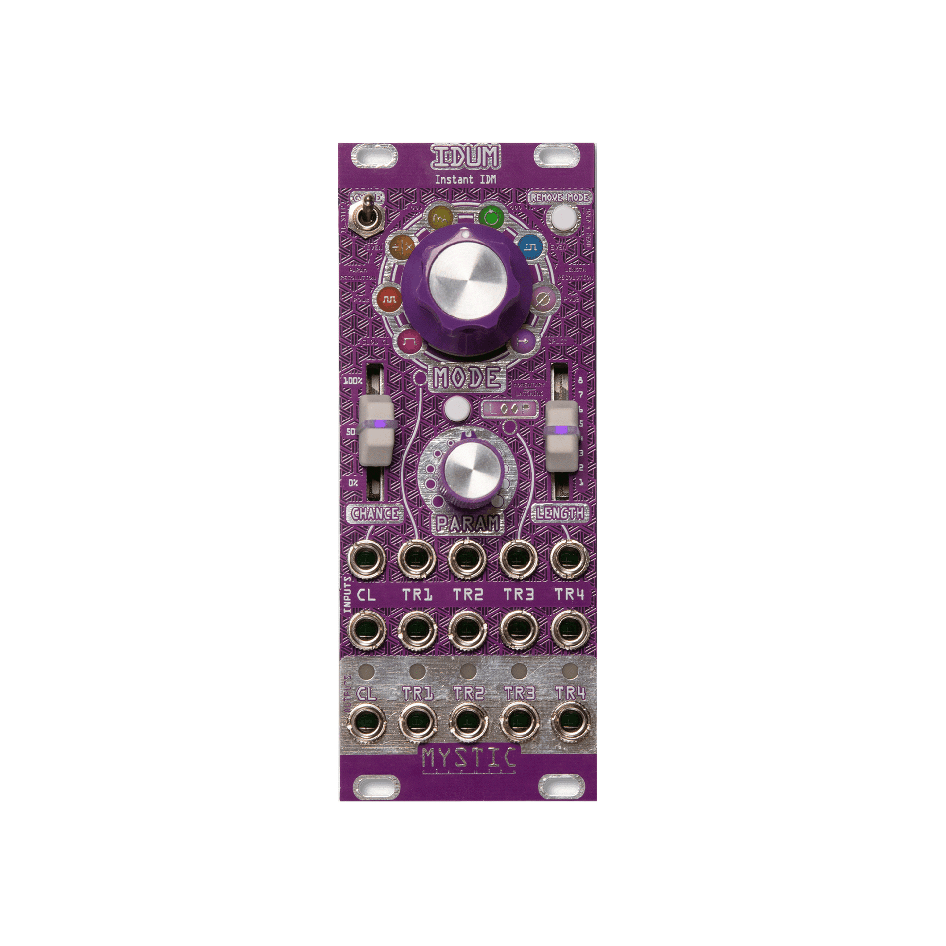 To control when IDUM's effects are active, the CHANCE slider sets the likelihood that on a given step an effect will activate and the LENGTH slider sets how many steps the effect will last for. The PARAM knob controls a parameter unique to each effect while the MODE knob selects the mode. All of these controls as well as the LOOP status have their own CV modulation inputs.
