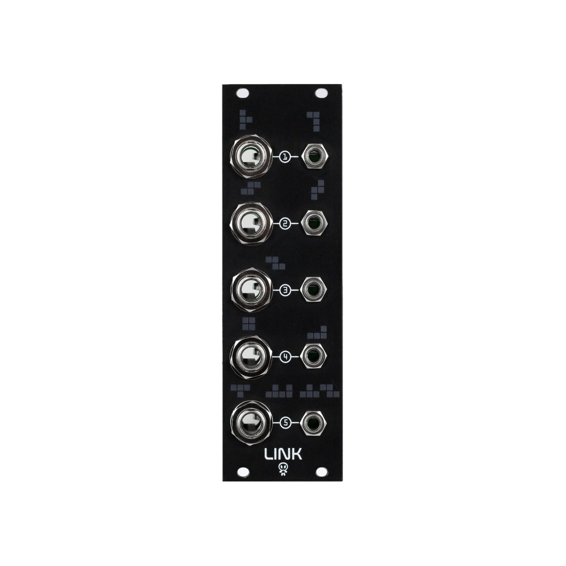 LINK is the module that bridges eurorack to destop mixers — it has 5 sections that attenuate eurorack signals to line level signals and send them to 6,3mm jacks for quality connection to the mixer. The module is 8HP wide.