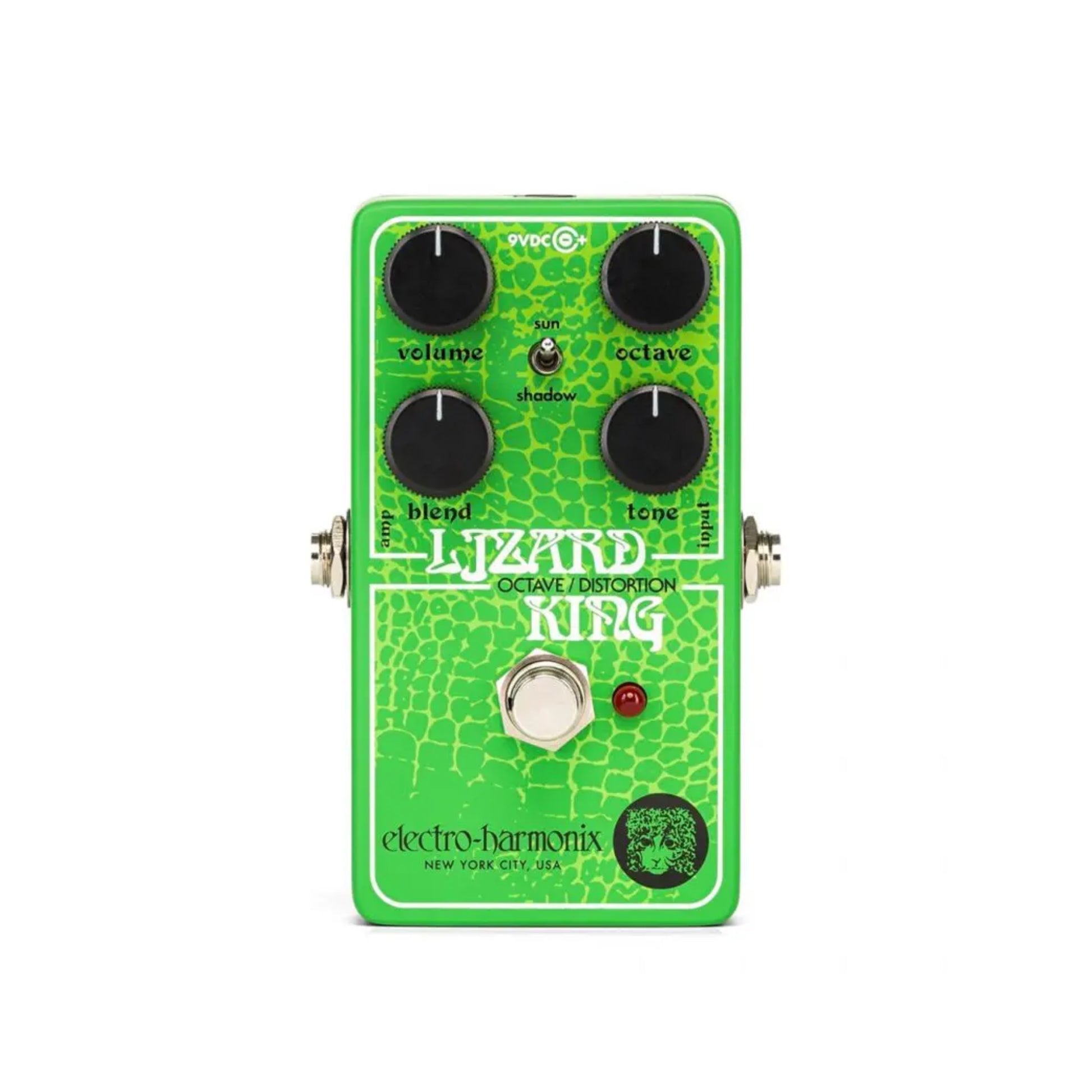 The EHX Lizard King is a fixed-gain fuzz that is dynamically responsive. Adjustments to your instruments volume affects the amount of fuzz. Lower instrument volumes create a clear, fuzzy overdrive, while full instrument volume sends the gain over the top for ripping riff and searing solo tones. The familiar VOLUME and OCTAVE knobs control overall output and octave blend volume respectively. New to the Lizard King, the BLEND knob sets the mix between your clean and fuzz tones to create the perfect balance of fuzz while retaining your bass’s attack and low-end. The TONE knob is a low pass filter that rolls off the highs, while the SUN/SHADOW switch further enhances the tone of the octave fuzz and clean tones. SUN boosts the octave fuzz with a more driving midrange, and the clean tone accessed by the BLEND knob has more treble and bass frequencies. When the switch is set to SHADOW, the clean tone is unchanged, and fuzz tone is tighter.