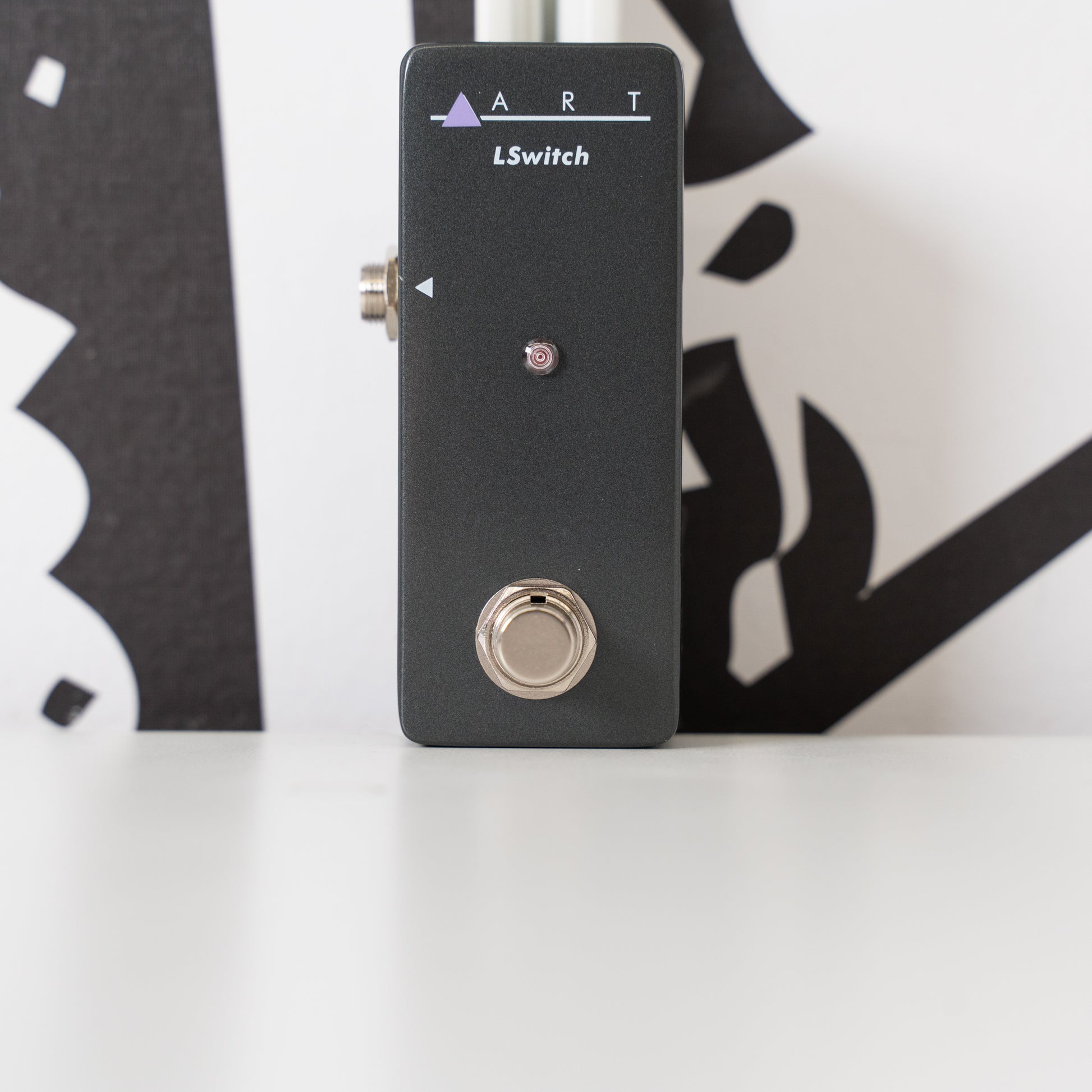 It features a compact, pedalboard-friendly enclosure, and a status LED that can be powered by the switching circuitry on the connected device. The LSwitch connects using a standard 1/4" patch cable.
