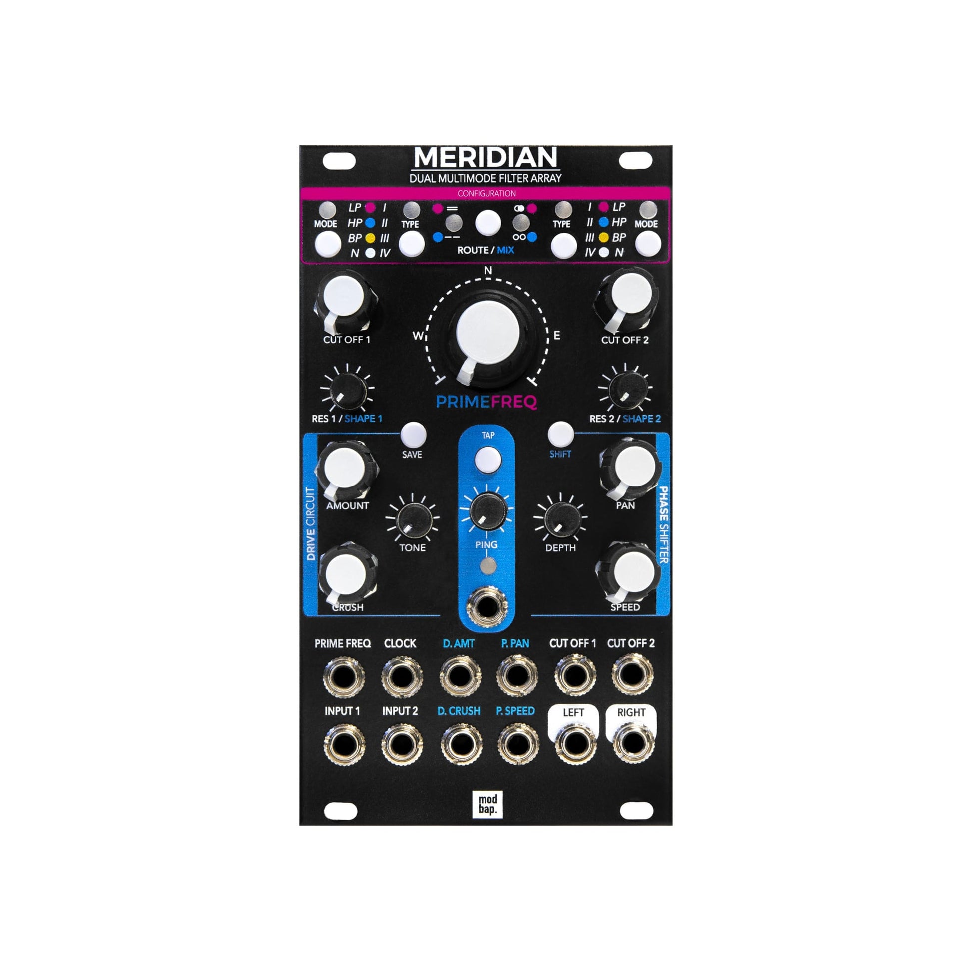 Meridian is a 14hp digital dual multimode stereo filter array, designed to offer users a choice between 4 selectable filter types per side and 4 selectable filter modes per side, plus 2 effects (drive & phase shift), and the ability to be pinged. This allows users the flexibility to easily create a range of unique sound textures and sonic landscapes using a single powerful eurorack filter module.