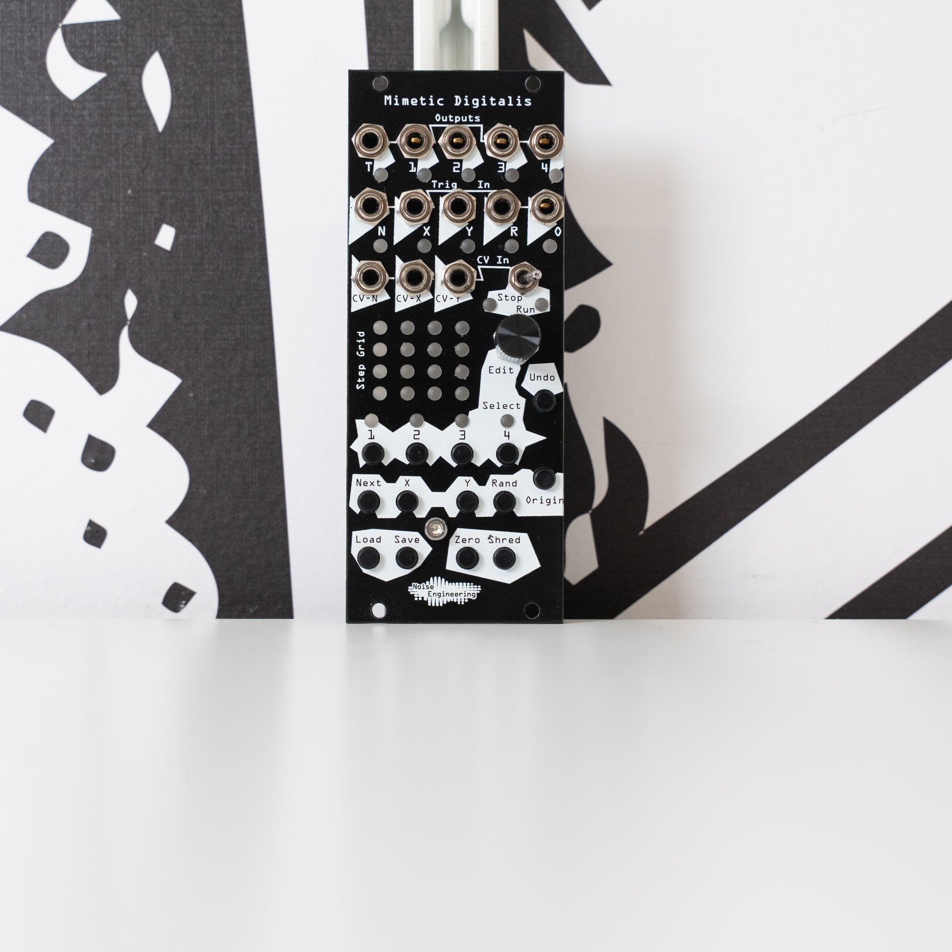 Mimetic Digitalis is a 10HP step sequencer optimized for live use and includes four individually editable CV outputs and a trigger out. Each step can be manually programmed, or you can record CV live using the encoder. The zero button deletes the CV at a step and shred randomizes the voltage per step or for all steps on selected channels. Edit a pattern and use undo to return to the unedited version. Save and load up to 16 patterns, with 8 on-the-fly slots for easy access during a set. Mimetic Digitalis is a performer's dream.
