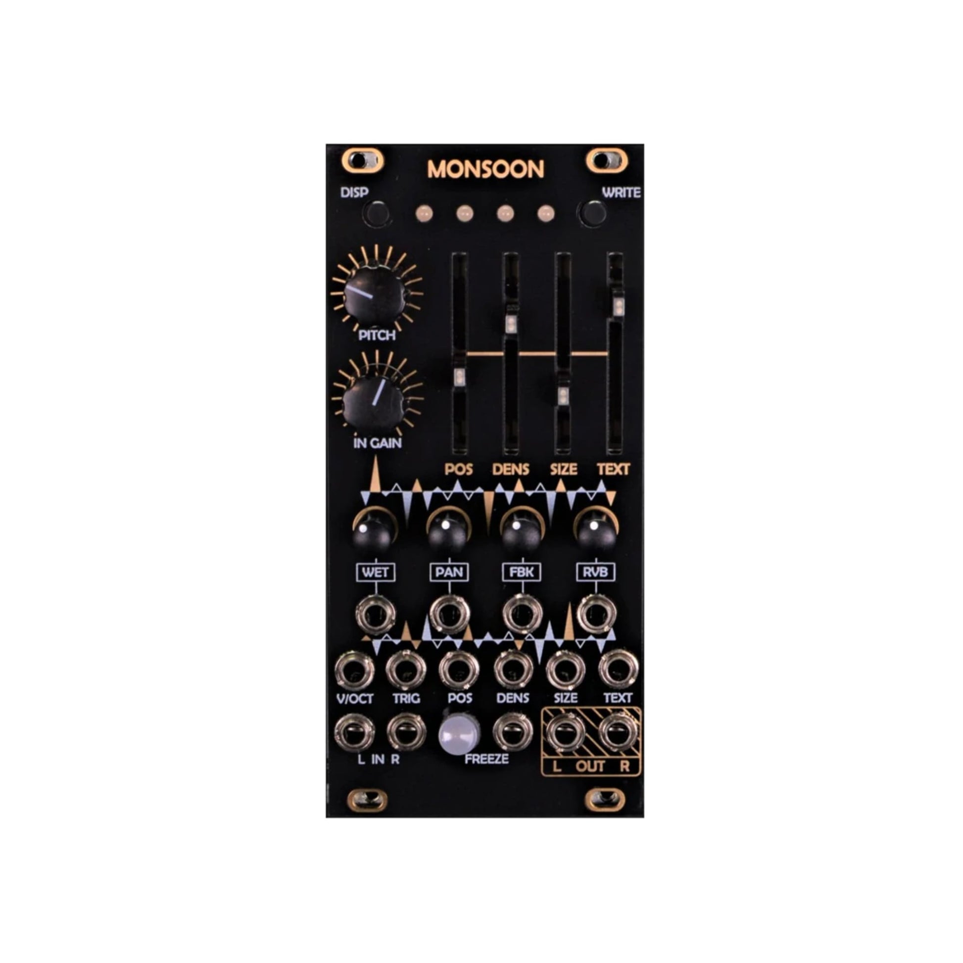This is a new build of a Monsoon, which is a variation of Mutable Instruments Clouds with separate CV and controls for the 4 “blend” functions. The 4 LEDs on the sliders indicate incoming control voltage for the 4 main parameters. The button which was used to select blend parameters now simply switches what the 4 LEDs display (audio input monitoring or monitoring the 4 blend amounts.) Parasites 2.01 firmware is loaded by default. Alternative firmware can be loaded by request.