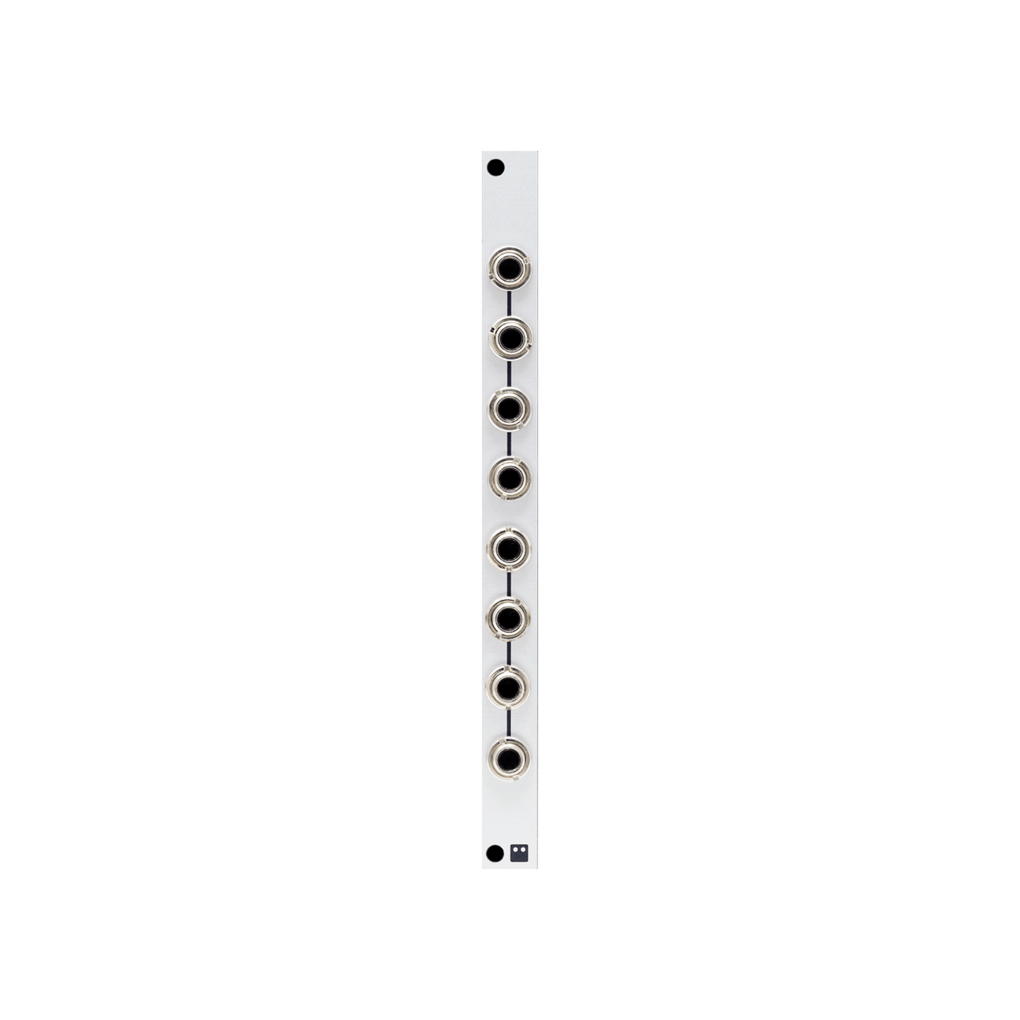 Mult is a dual 4-way passive signal multiplier. It takes one audio or cv signal, and routes it to up to three multiple unbuffered outputs. It requires only 2HP of width, and because the Mult is a passive module, it requires no power to operate.