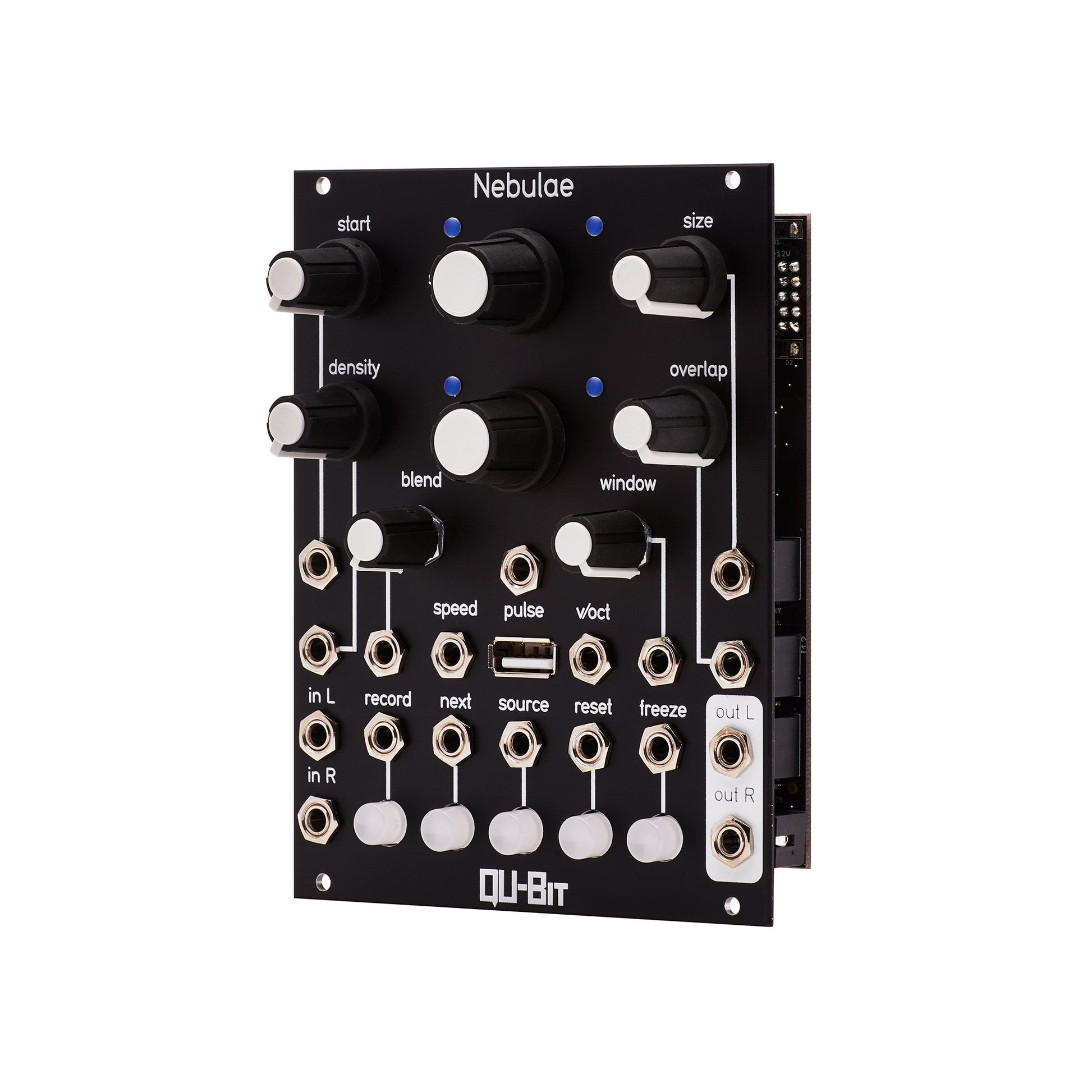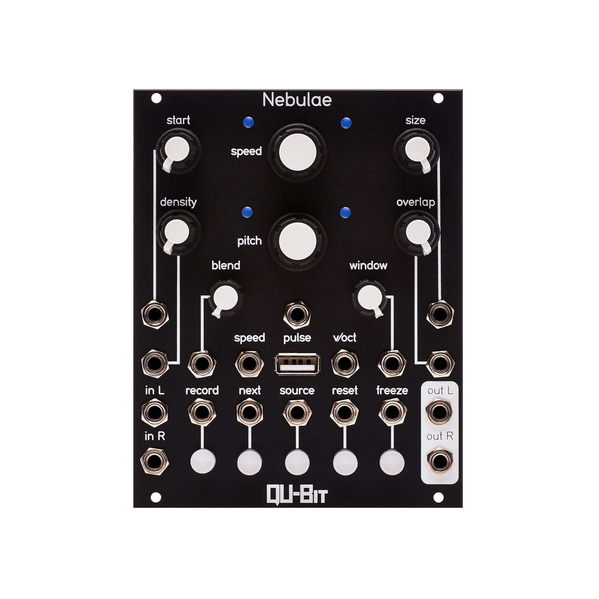 Nebulae is a granular sampler and DSP platform. Its phase vocoder audio engine provides elastic audio, which can be time stretched, granularized, and mangled to no end. With independent control over pitch and speed, and granular controls such as overlap, window, and density, finding new sonic territory is only a knob turn away. Nebulae can use live audio input, a recorded buffer, or audio files as the source material for its powerful audio manipulations. The live input buffer can record up to five minutes of stereo audio at 48kHz, 24 bit. In addition, up to 75 MB of stereo audio can be loaded simultaneously through the USB port. No naming convention or special formatting necessary; just plug and play.