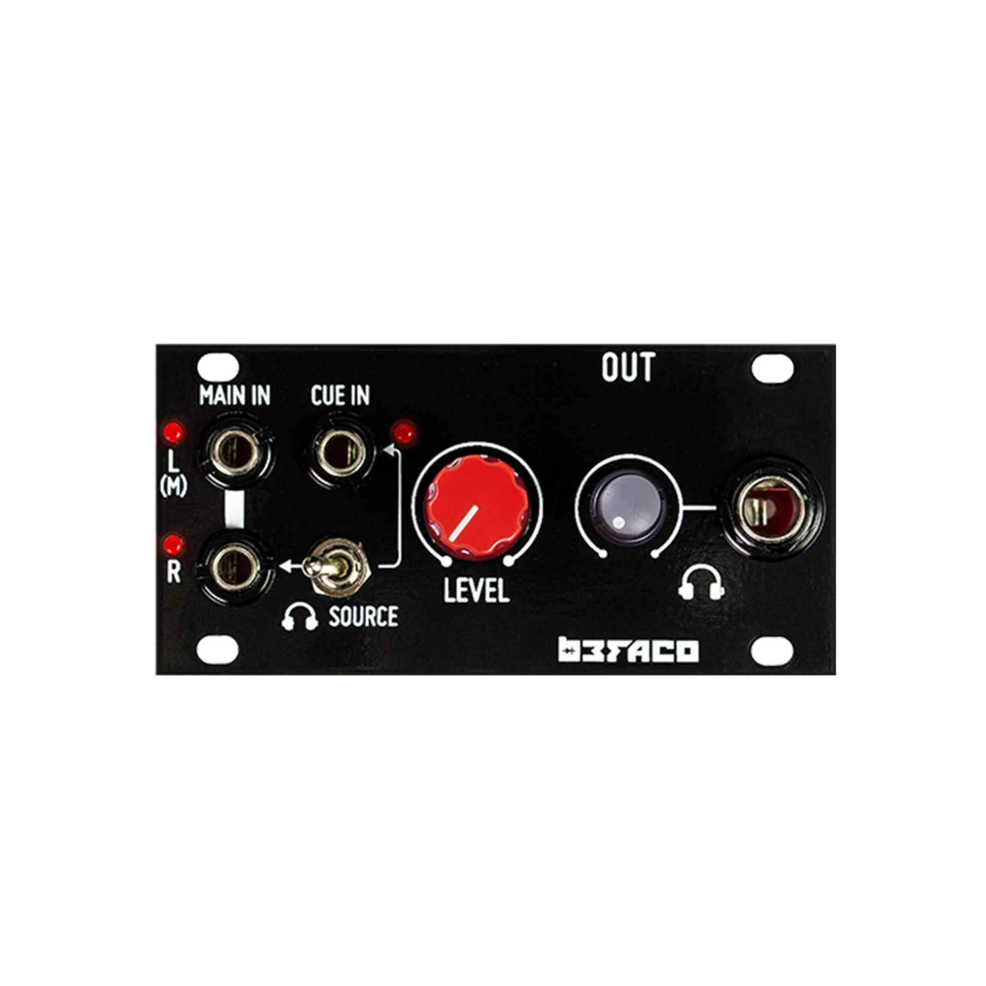 Out is a 1U stereo output module designed to convert audio signals from your modular to line-levels. The module is designed to be used on cases with onboard Jack connectors or Intellijel 7U and Palette series, as it uses the same pinout. The module also includes a high-quality Headphone amplifier with an auxiliar monitoring CUE input.