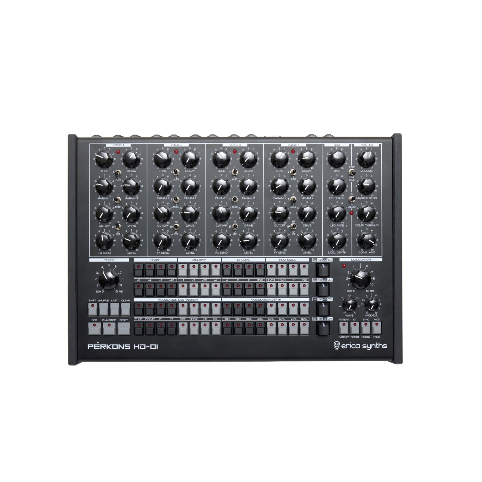 PĒRKONS features four sonically versatile hybrid voices (digital sound engine + analogue multimode filter with overdrive) and a sequencer with simultaneous control over all four percussion tracks.