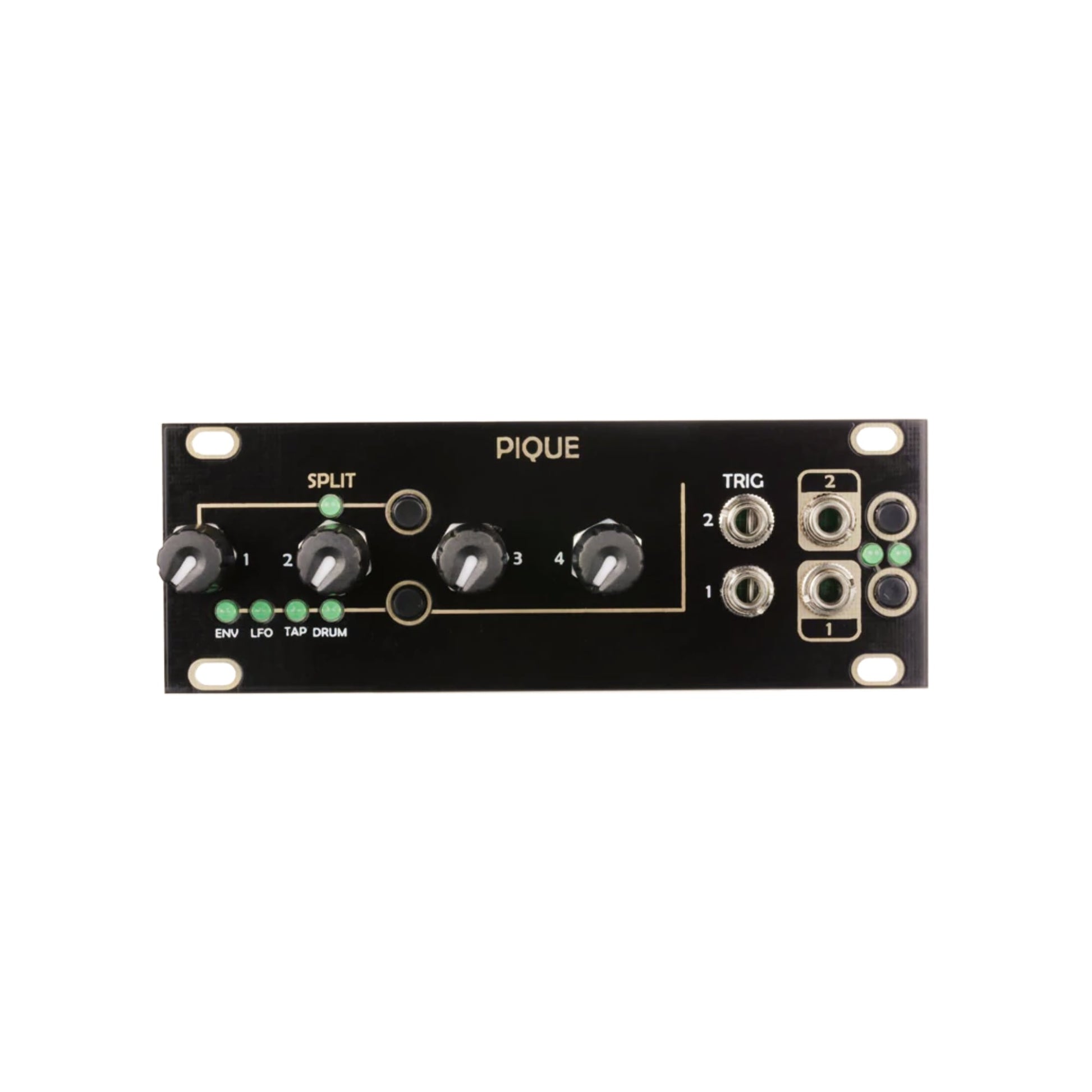 This is a 1U (Intellijel format) version of the Pique module which is based on the popular Peaks module from Mutable Instruments. It can be an ADSR-style envelope generator, an LFO and a drum emulator. By default we will load the Dead Man’s Catch (DMC) firmware which adds the Alt ENV, ALT LFO, ALT Tap, Alt Drum modes below. We are happy to load the stock firmware as well. Just send us a message with your order.