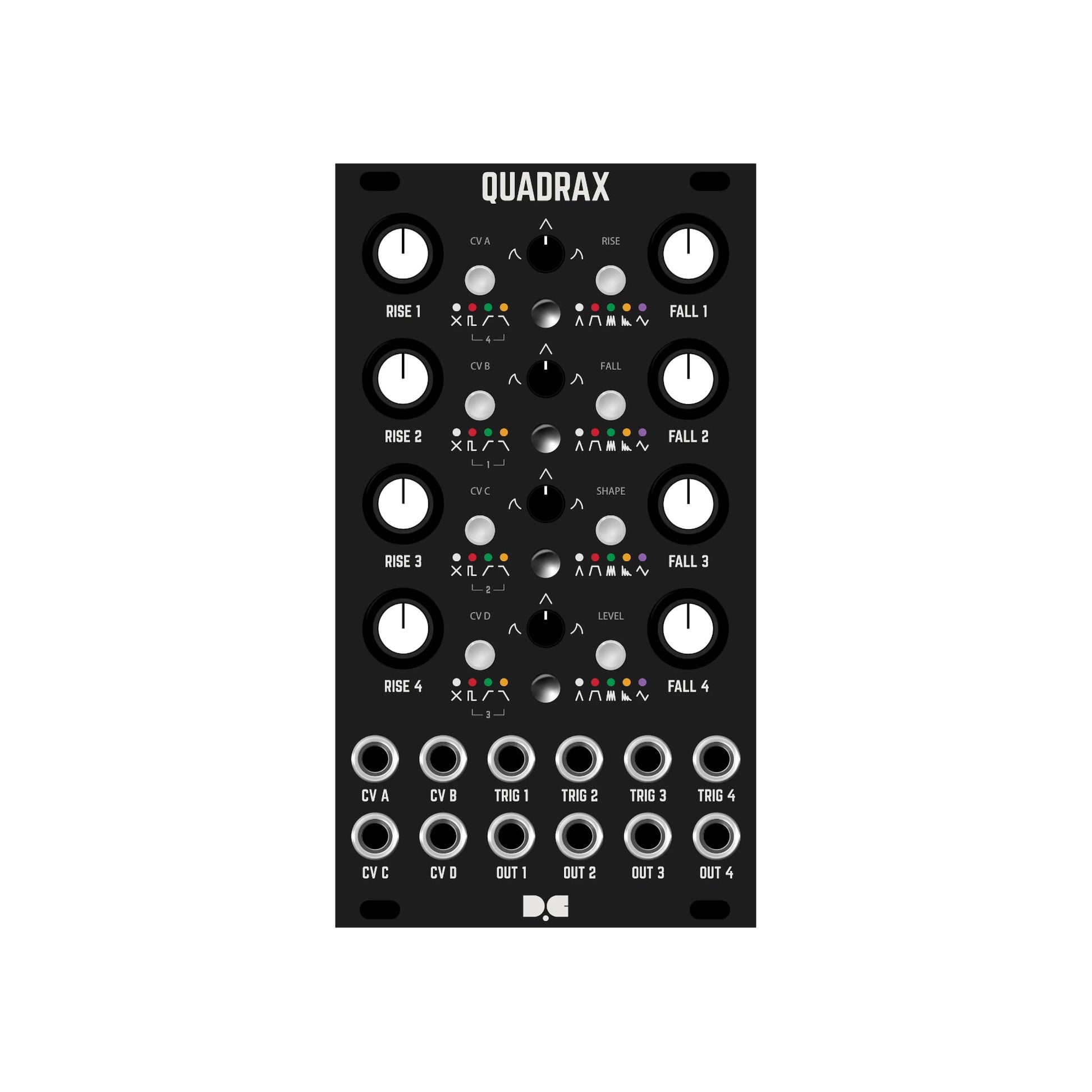This is a black and gold panel designed for the Intellijel Quadrax module. The design is clean and simple, with a few tweaks compared to the original one. It has wider racking holes that makes it possible to adjust the position of the module precisely on your case.