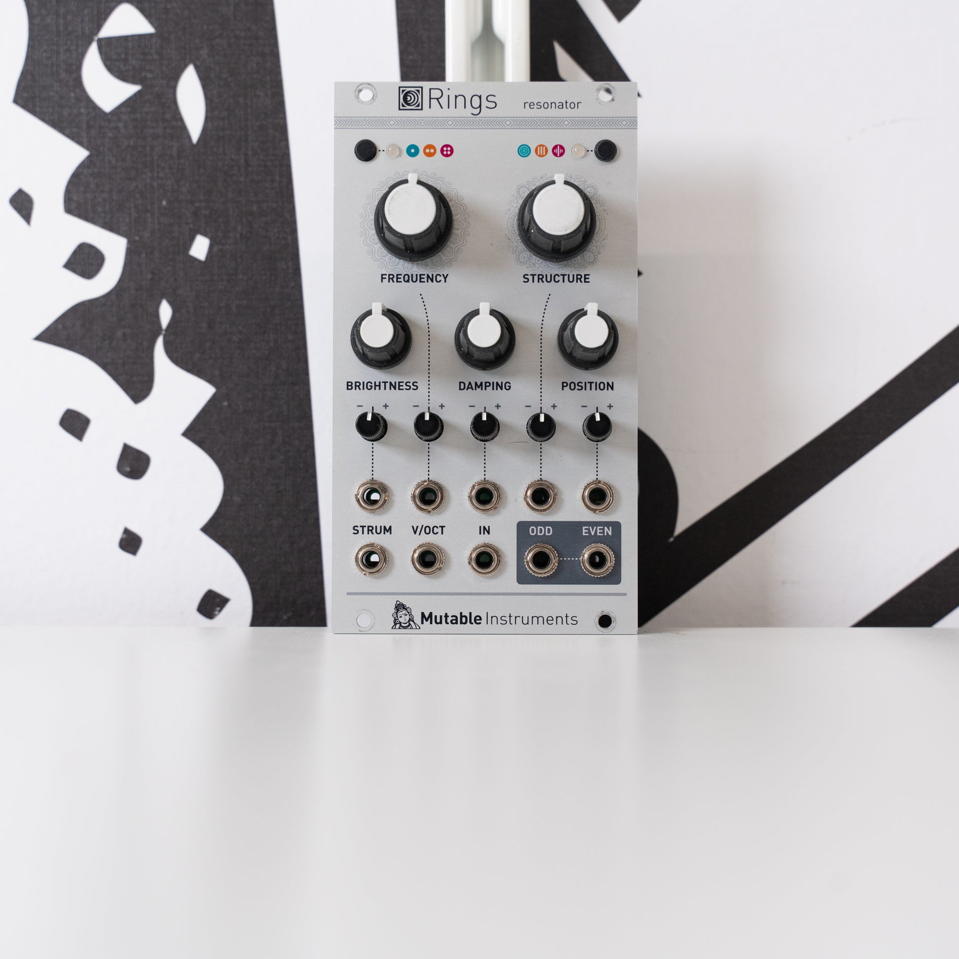 The physical modelling building block for eurorack. Instead of trying to be a complete instrument, Rings focuses on the key ingredient, the resonator, ready to be excited by envelope clicks, trigger pulses, granular noise or any other audio source produced by the rest of your system.