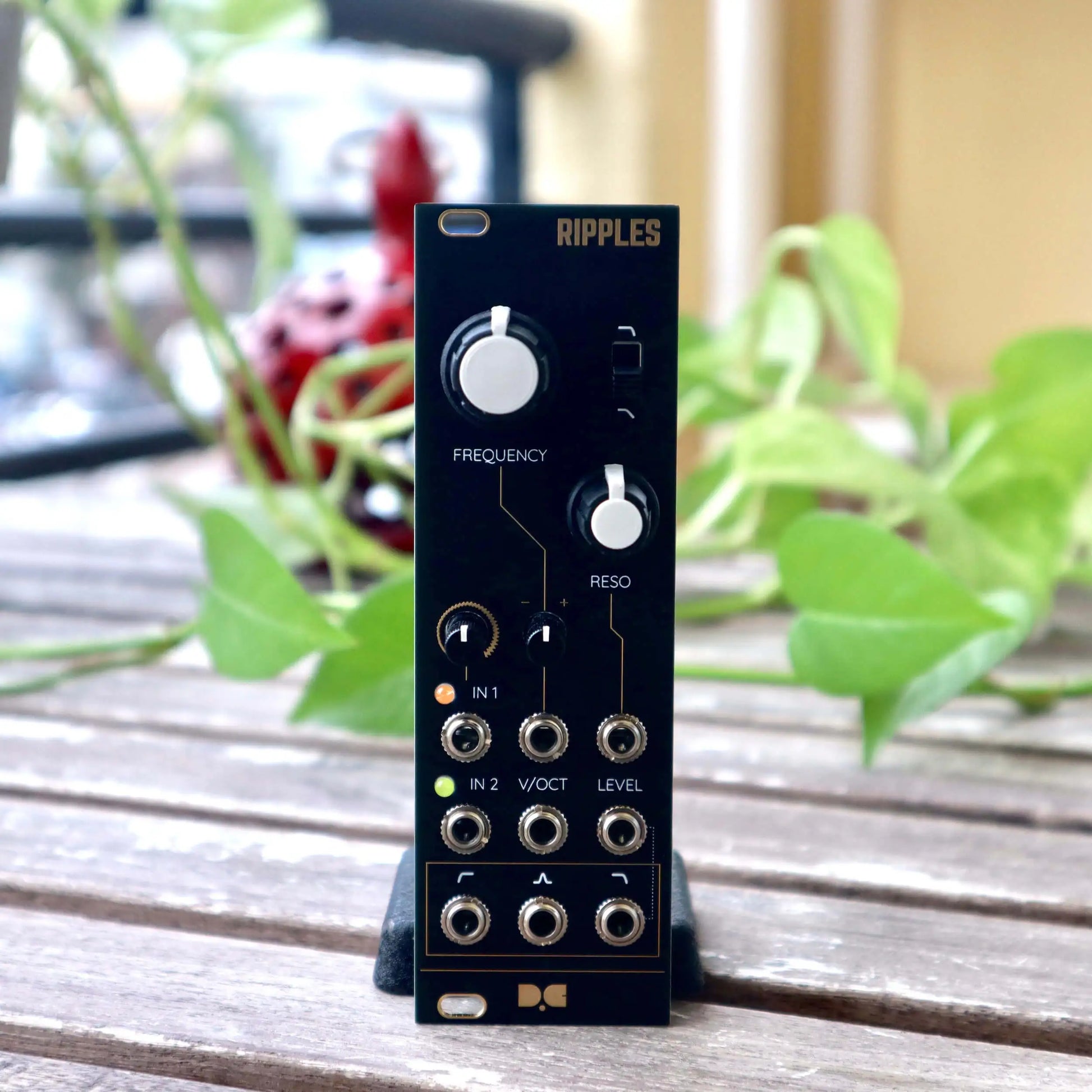 This is a black and gold panel designed for the Mutable Instruments Ripples module. The design is clean and simple, with a few tweaks compared to the original one. It has wider racking holes that makes it possible to adjust the position of the module precisely on your case.