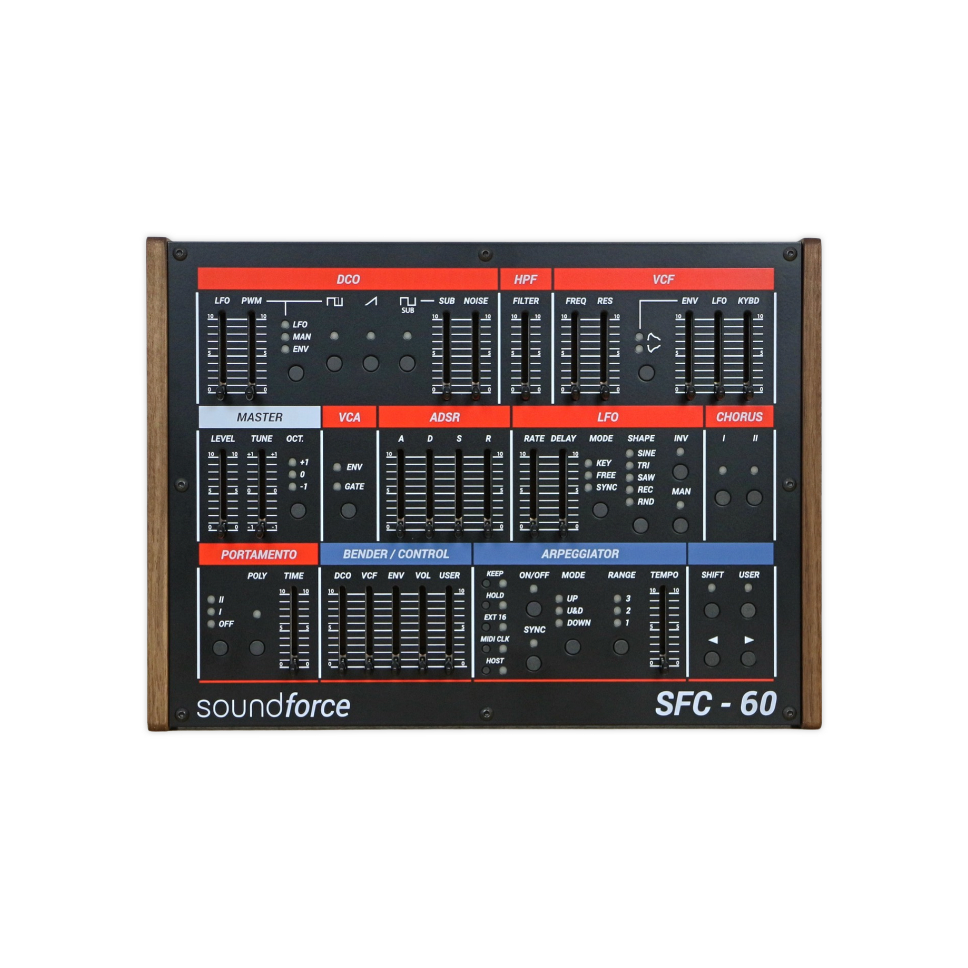 The SoundForce SFC-60 V3 is a boutique class-compliant USB-MIDI controller dedicated to the fantastic TAL-U-NO-LX Juno-60 emulation. The original SFC-60 was the first SoundForce product to come out. I have come a long way since 2014 and this new version is based on all the lessons learned from several years of designing and manufacturing similar products. With a solid sheet metal case, colorful front panel and new software integration, it’s my favourite controller so far. It is usable with any MIDI-mappable software or hardware but has special integrations with the TAL-U-NO-LX.