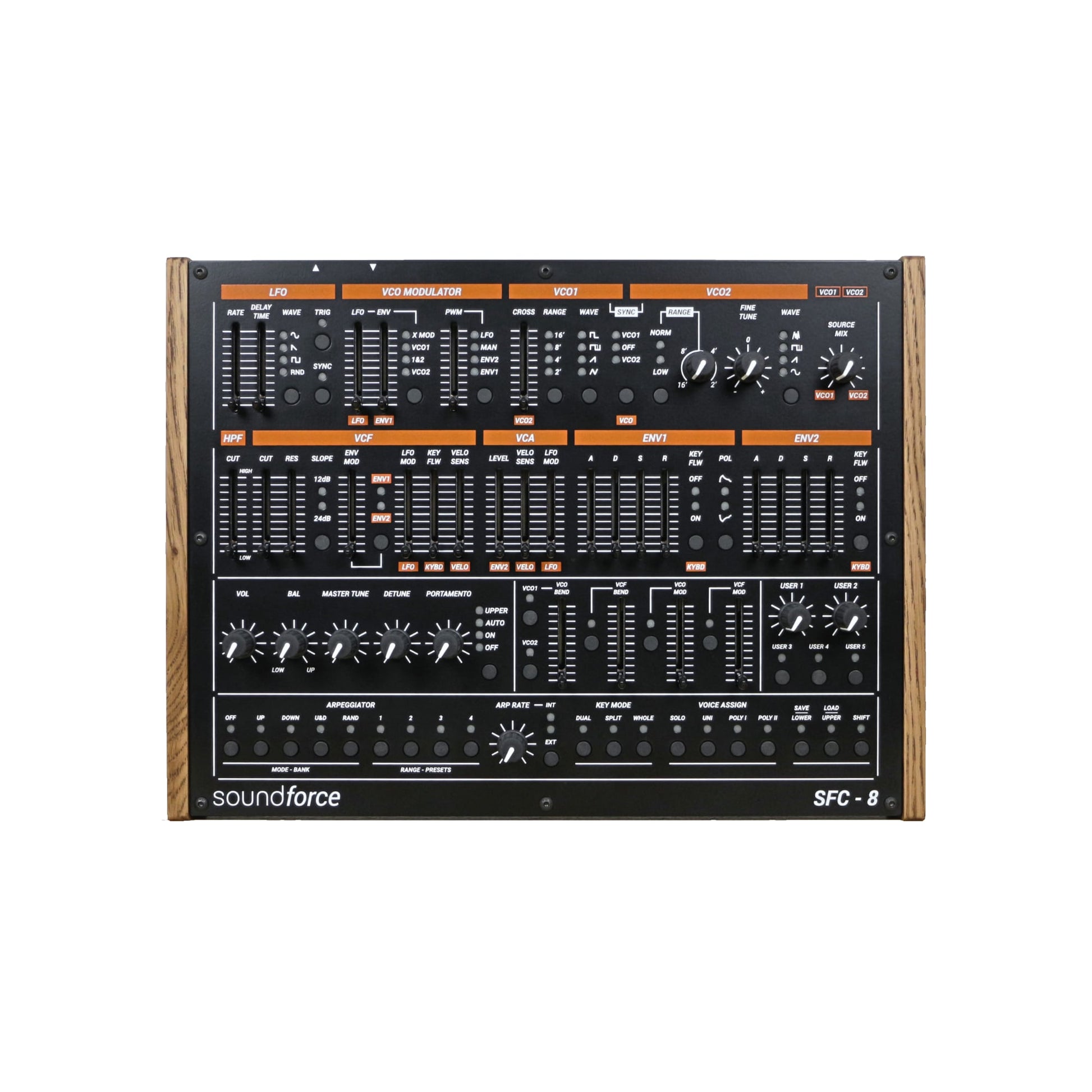The SoundForce SFC-8 is a boutique class-compliant USB-MIDI controller dedicated to Jupiter-8 plugin emulations. It is usable with any MIDI-mappable software or hardware but the panel layout has been designed especially for Arturia’s Jup-8 V and the TAL’s J-8. Considering the differences in the plugins front panels, 2 modes have been programmed to suit the control panel layouts of the 2 plugins perfectly.