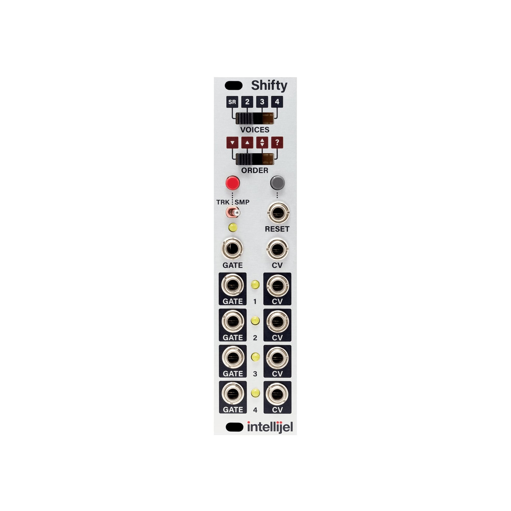 Shifty is a combination of four sample and hold stages, a sequential gate, and a sequencer controller. This collection of functions allows for some inspiring and useful utility applications, such as clock dividing, or controlling up to four voices with intricately evolving melodies or chord changes.