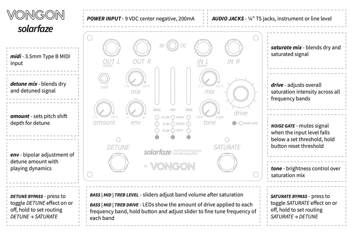 additional features include a built-in NOISE GATE for high-gain settings and flexible effect routing that allows SATURATE to run before DETUNE or vice versa. the pedal supports both analog buffered bypass for zero-latency pass-through and DSP bypass for completely silent effect toggling. MIDI control extends the possibilities further, with nine onboard user preset slots and remote adjustment of every parameter