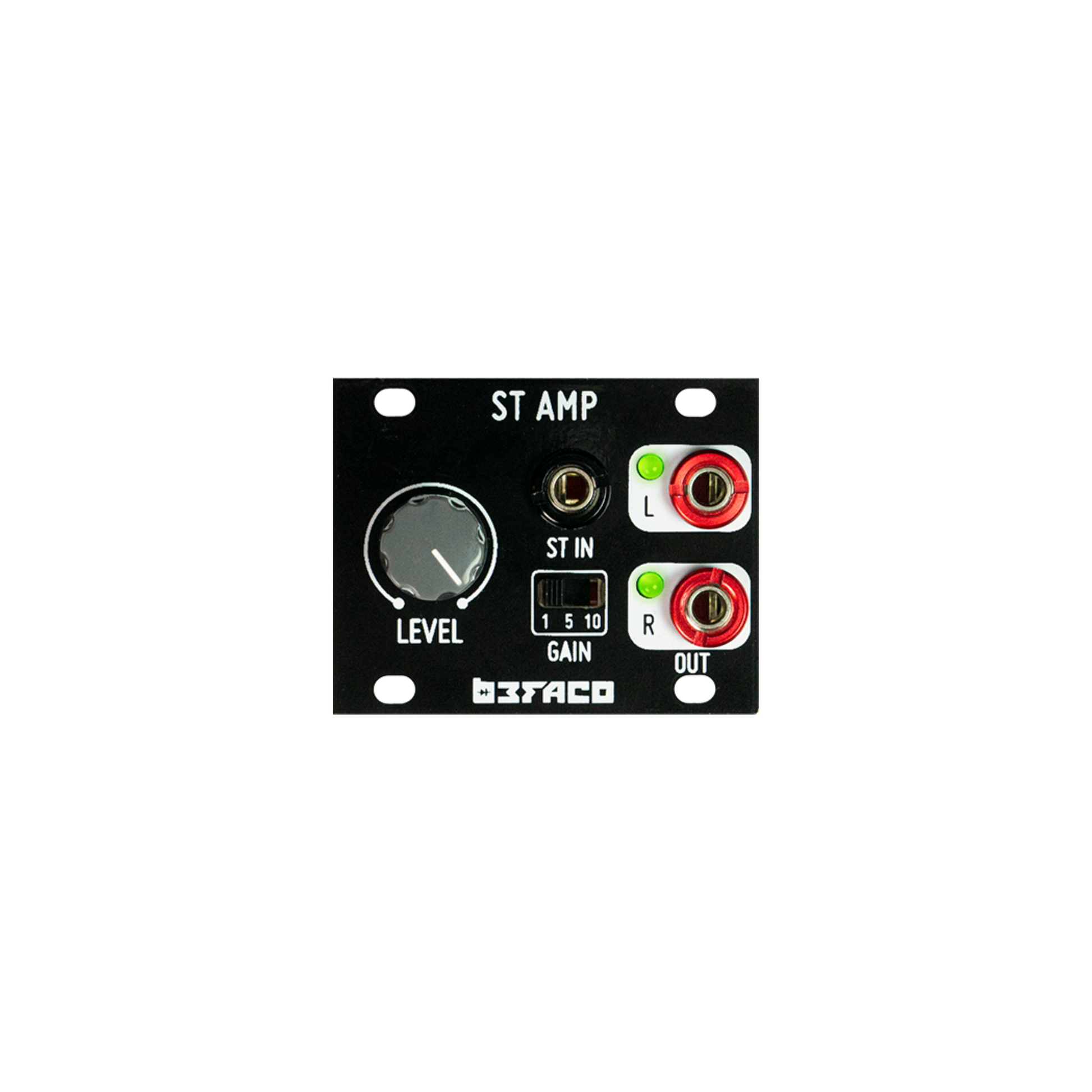 ST Amp is a 1U stereo amplifier designed to boost your external signals into modular levels. The module is designed under the Intellijel 1U format and uses the same pinout, making it fully compatible with the Intelljel case’s rear connectors.