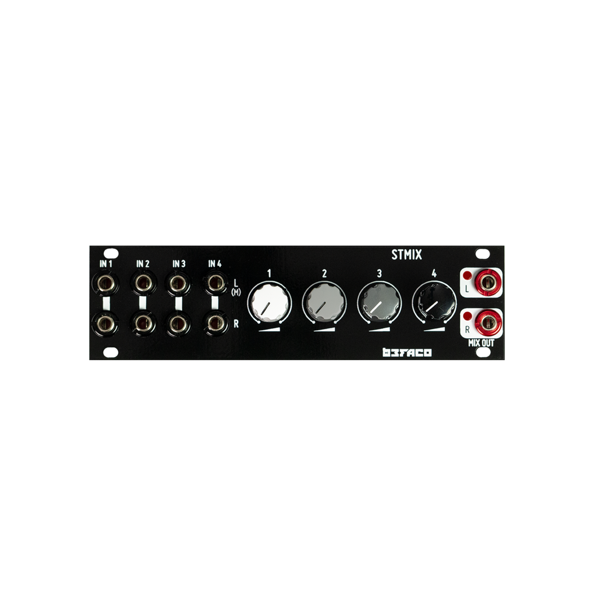 STMix is a four-channel stereo mixer in 28hp and 1U format. It can work independently or as an expansion of our Hexmix module via the six-pin connector located in the back. The module is designed under the Intellijel 1U format.