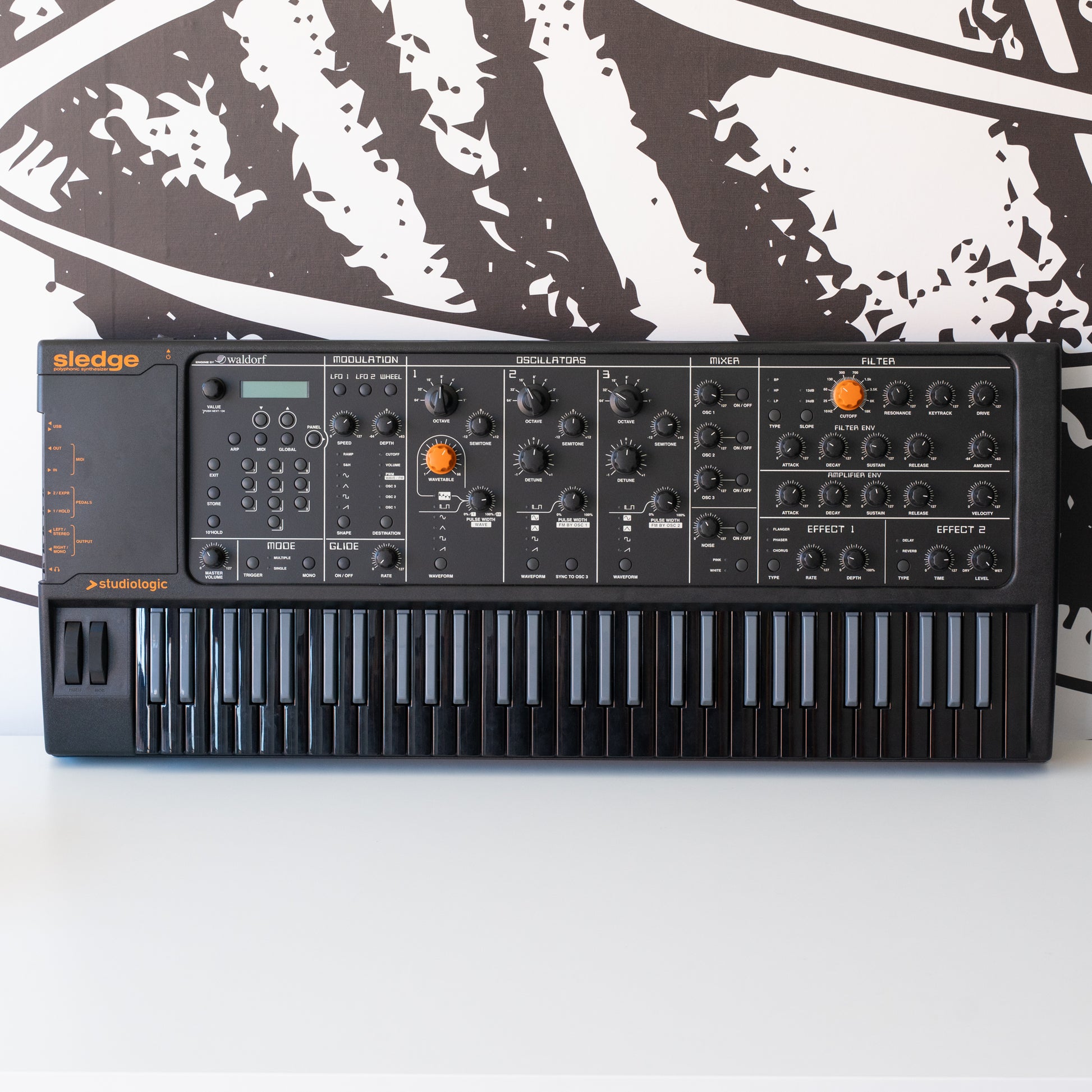 24 voice virtual analog synth with sweepable Waldorf wavetables and sample playback. Waldorf designed synthesis engine channels the power of the Blofeld with more immediate hands-on control. Three oscillators per voice, resonant filter and easy to use delay and reverb effects built in. Fantastic 5 octave semi-weighted Fatar keyboard with black and grey keys.