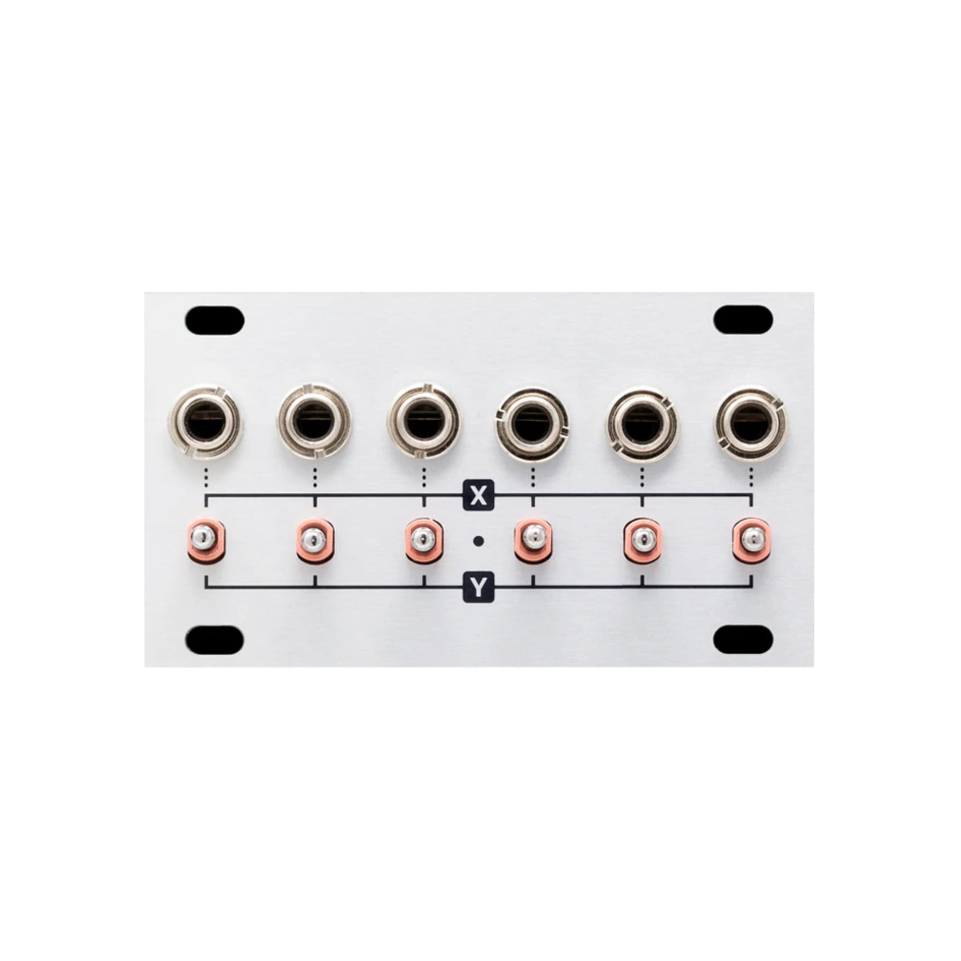 Switched Mult 1U is an expandable, dual-bus, 6-jack passive signal multiplier, with a 3-position switch to facilitate asymmetrical routings — enabling each jack to be a mult of the X bus; a mult of the Y bus; or to be turned off entirely.