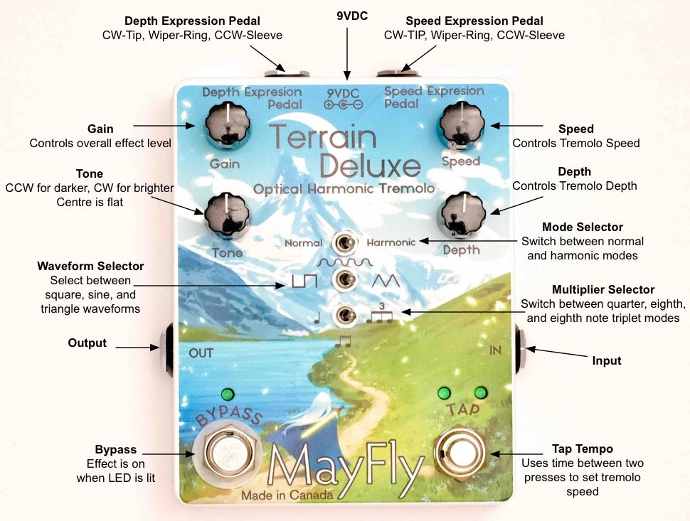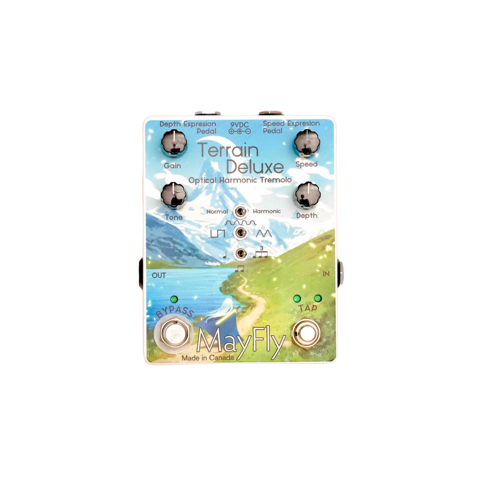 The Terrain Deluxe is an optical harmonic tremolo. It modulates the Bass and Treble frequencies separately: it uses an electronic crossover to split the signal, then it uses two independent optical tremolo circuits to modulate the two signals 180 Degrees out of phase with each other. The two signals are then mixed back together resulting in a tremolo that swirls and sparkles in three dimensional space. There is a switch to go between normal and harmonic modes, and a tone control that acts as a mixer between the high and low frequency signal paths.