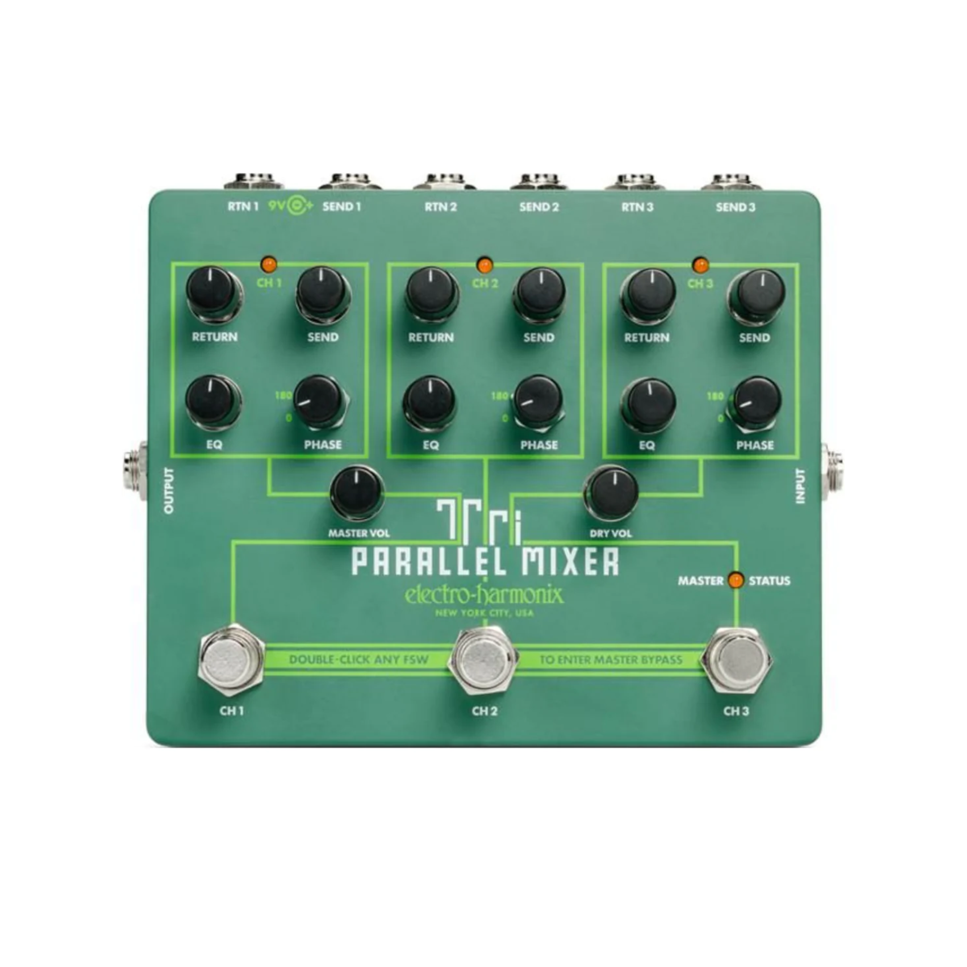 EHX’s Tri Parallel Mixer is a powerful effects creation and mixing hub. Three separate FX loops with flexible controls allow for multiple configurations, as follows: