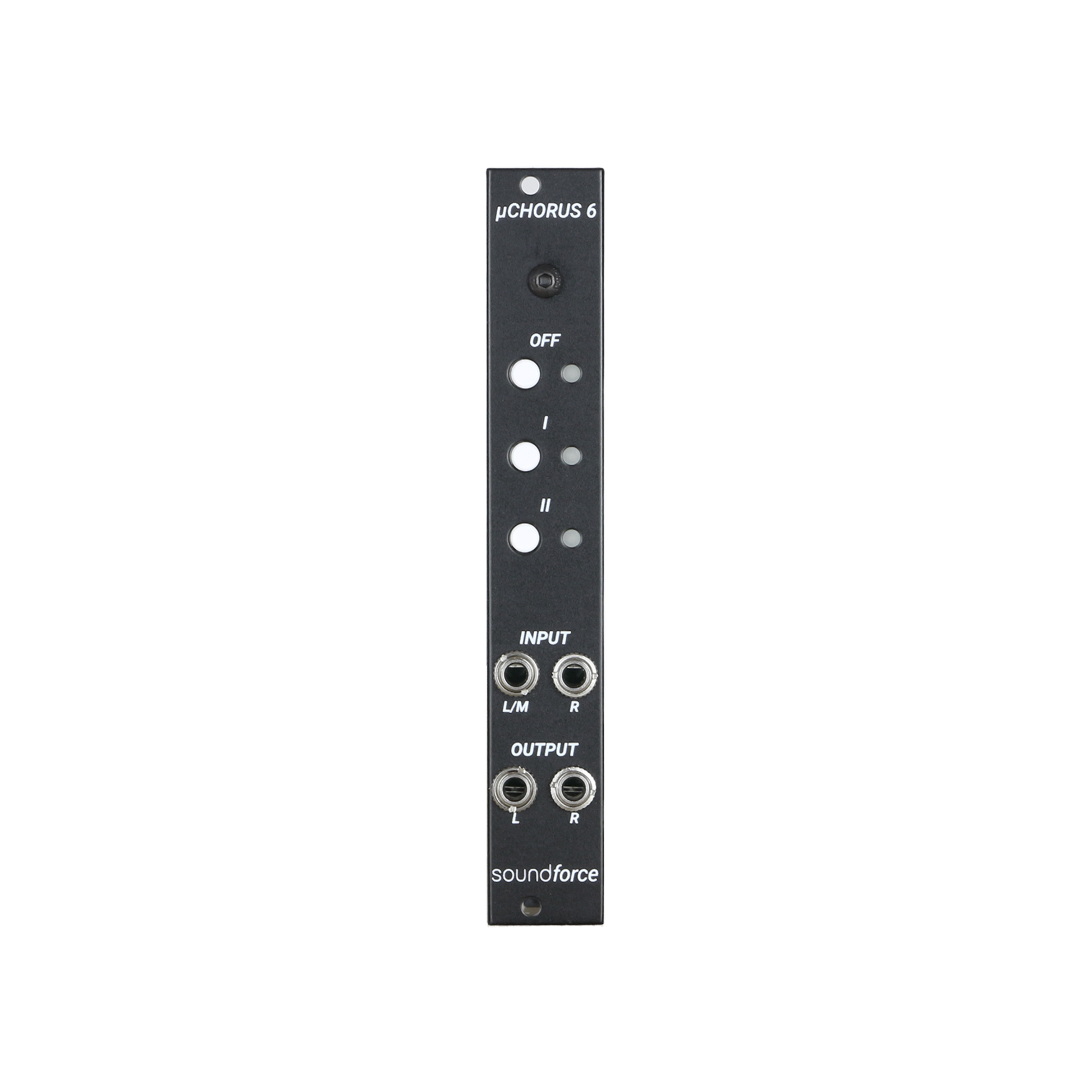 The SoundForce uChorus is 4HP compact version of the classic Juno style BDD chorus. It is using the Xvive MN3009 and the same audio path as the original circuit. It can do the classic Juno I, II and I+II modes. I+II modes are available from both the Juno 6 and Juno 60, each in mono (as the original) or stereo, giving you 4 I+II options. This module is a stripped down version of the bigger Chorus 6 module which includes CV control.