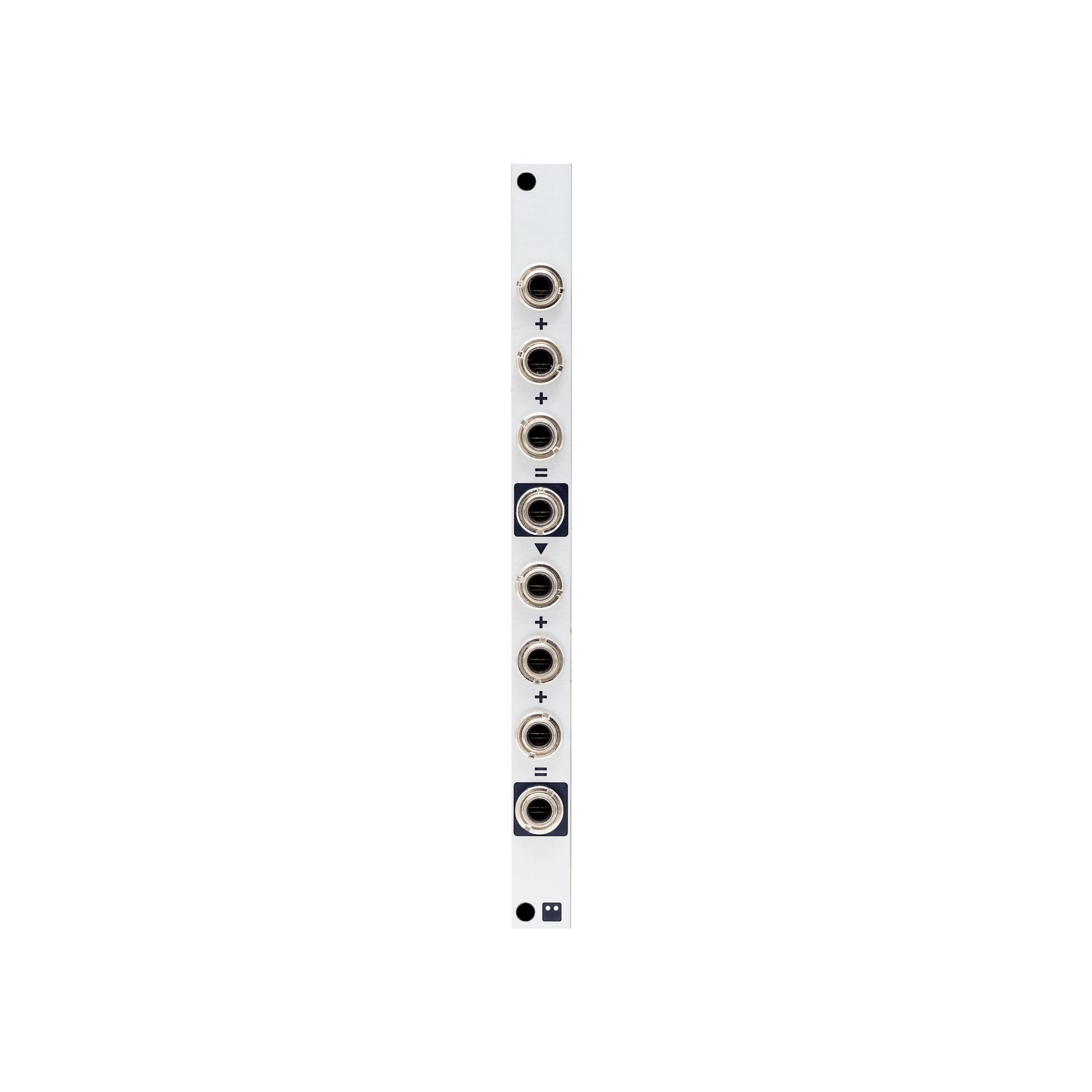 Two common problems that are encountered in many eurorack systems are that signals need to be blended together and a lack of case space. The Unity Mixer can help solve the first problem while simplifying the second with its skinny 2HP size. It features two sections where three input signals can be summed into one output, and the top is normalled to the bottom allowing the mixing of six signals into one.