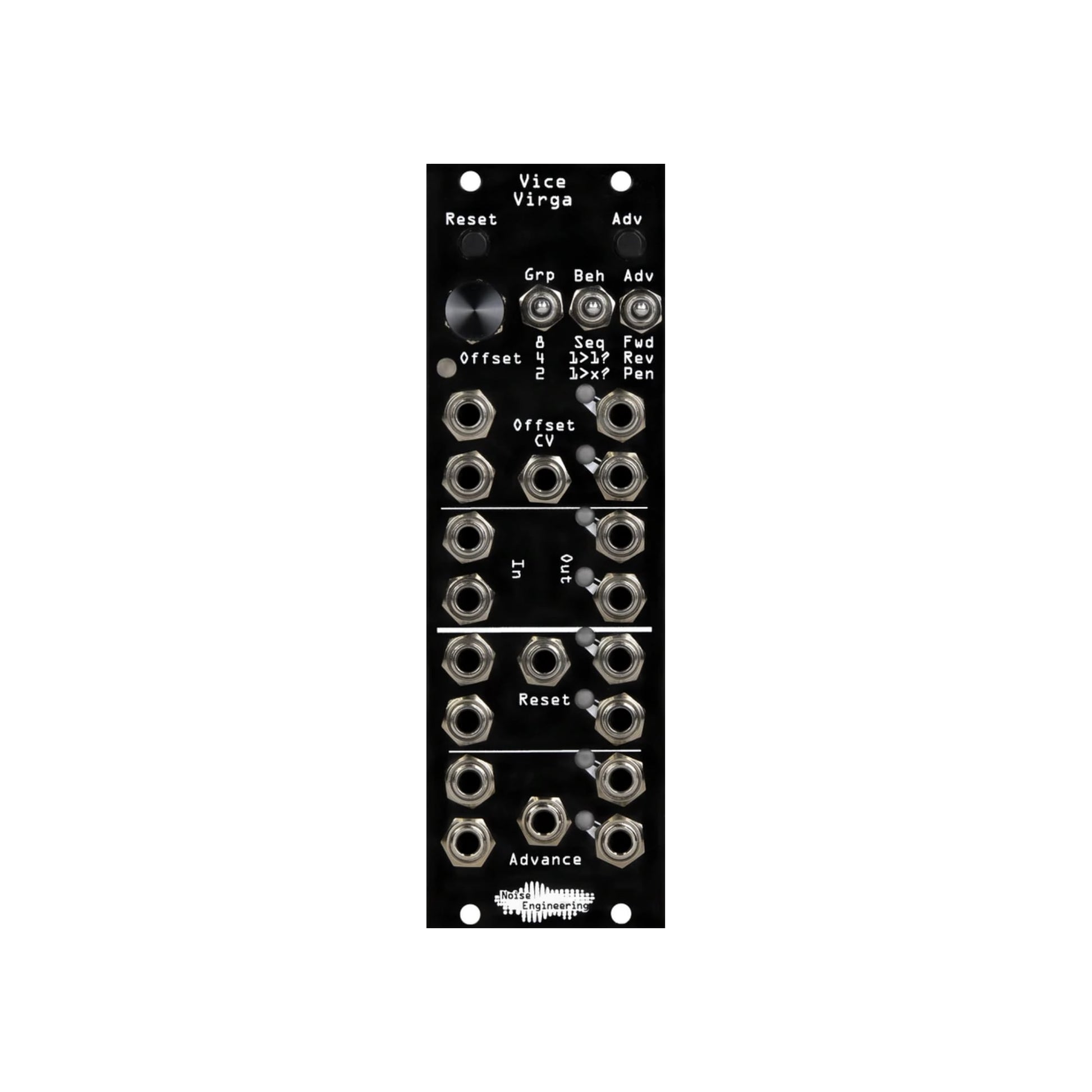 Vice Virga is an 8-input, 8-output sequential/addressable switch with a plethora of features and extensive patchability. Vice Virga can be configured as a single 8-channel switch, two 4-channel switches, or four 2-channel switches. Equal parts automated patch arranger and performance tool, Vice Virga has loads of switching control options. Whether you want to chain sequencers, swap outputs on an oscillator, remix a trigger pattern, or mix up every connection in a patch just to see what happens, Vice Virga can do it!